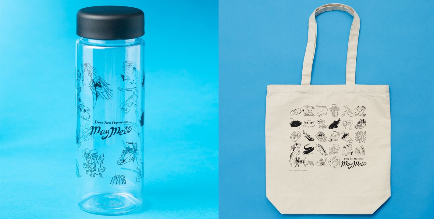 かわいい深海の生き物たちが並ぶクリアボトルとトートバッグ。