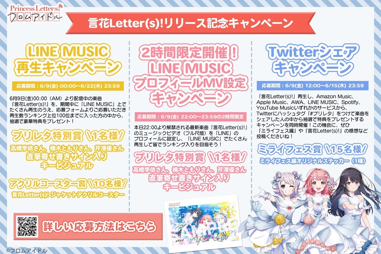 『言花Letter(s)!』を再生し、Amazon Music、Apple Music、AWA、LINE MUSIC、Spotify、YouTube Musicいずれかのサービスから、Twitterにハッシュタグ「#プリレタ」をつけて楽曲をシェアした人の中から抽選で特典をプレゼントするキャンペーンを同時開催! この機会に、ぜひ『ミライフェス編』や『言花Letter(s)!』の感想など投稿くださいね!