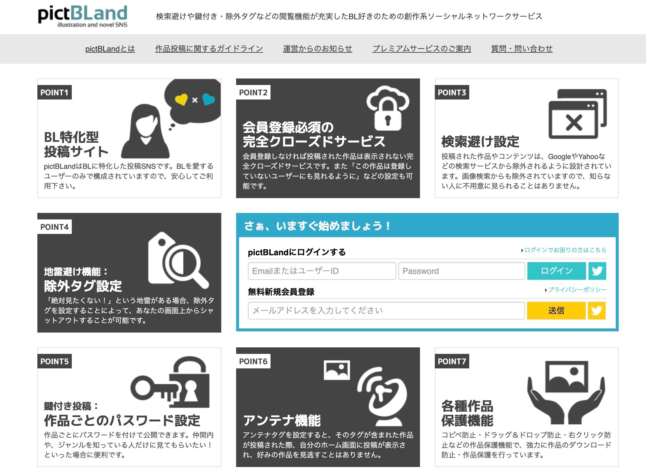 pictBLandは2013年4月25日より提供を開始した、ボーイズラブ(BL)に特化した作品投稿SNSです。