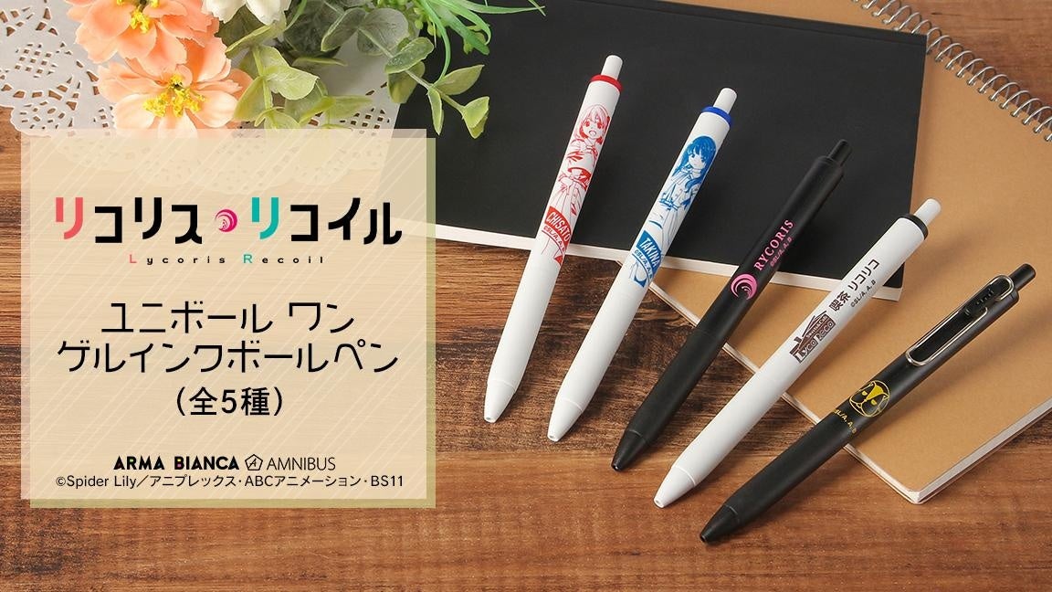 錦木千束、井ノ上たきな、リコリスの校章、喫茶リコリコのマーク、ウォールナットのマークをゲルインクボールペンに仕上げました。