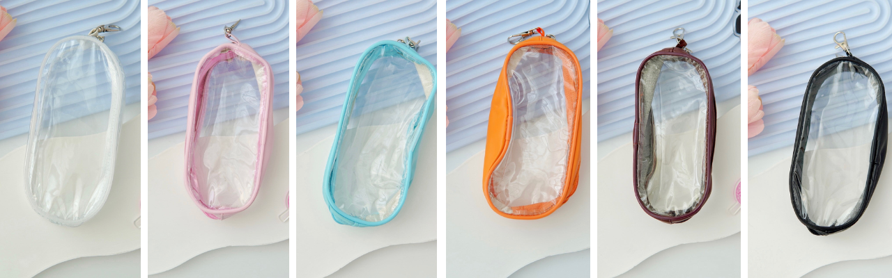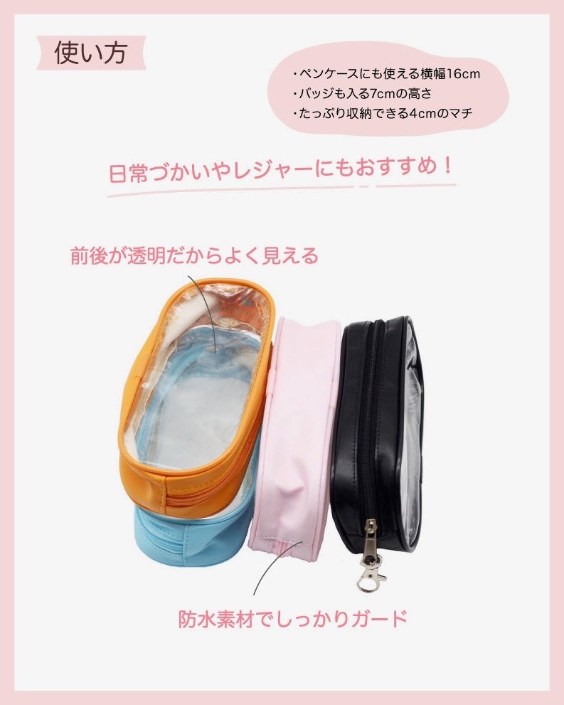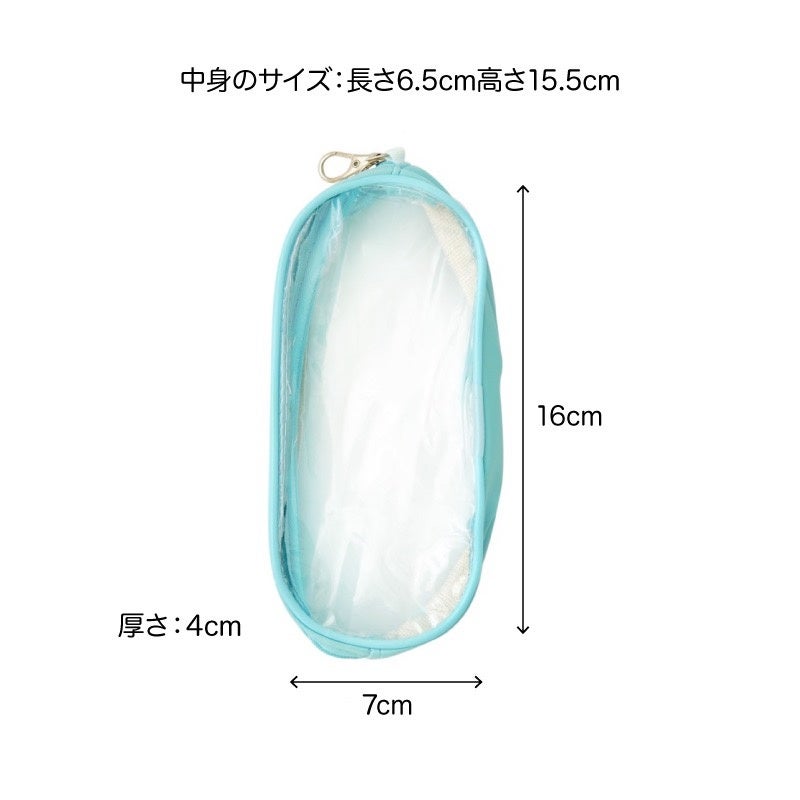 前後が透明で中身がしっかり見えるクリアポーチです。雨の日でも安心の防水仕様で、バッジやぬいぐるみ、アクリルスタンドなどのグッズをたっぷり収納できます。ペンも入る横長タイプは、日常づかいにもぴったりです。