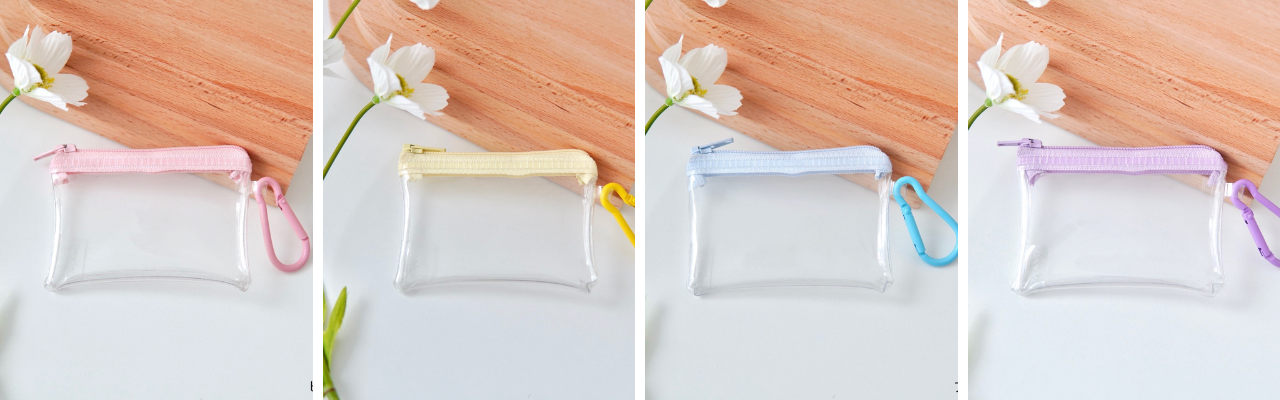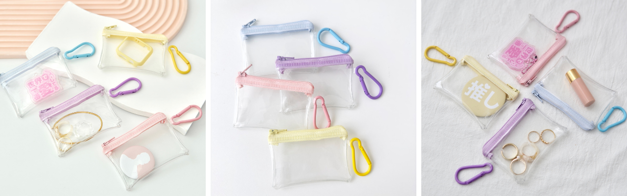 パステルカラーのアクセントが可愛いミニクリアポーチです。防水仕様のシンプルなデザインは普段使いしやすく、小さめの缶バッジの他にAirPodsなども入れられます。バッグに取り付けるのにも便利なカラビナ付きです。