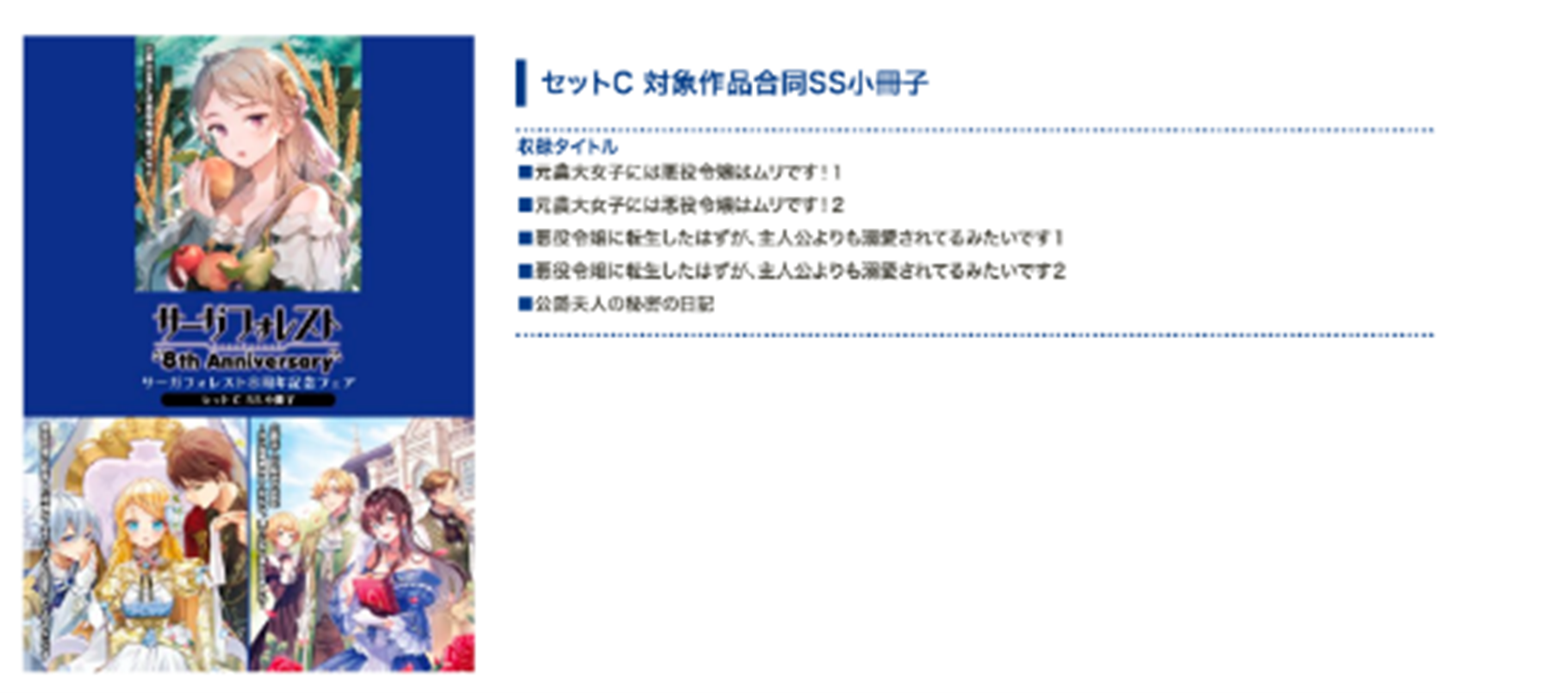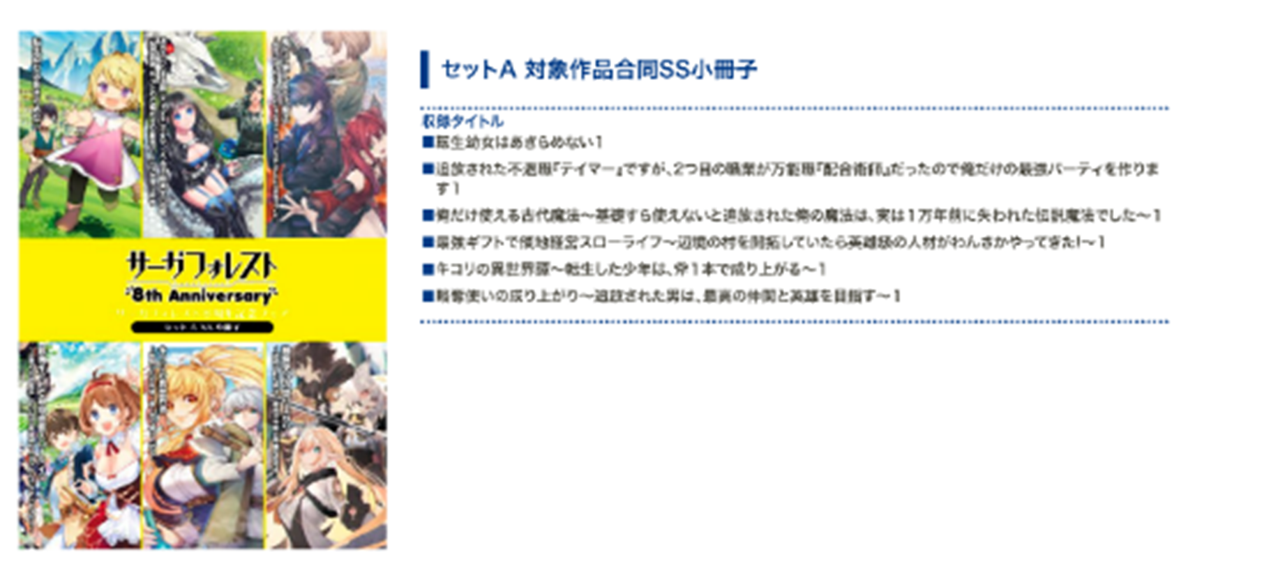 フェア期間中、協力店様において『サーガフォレスト』レーベルの対象作品をご購入頂いた方への特典として『SS集』をプレゼント! 当フェアへの参加店舗及び詳細につきましては、下記、『サーガフォレスト創刊8周年記念フェア』のページをご覧ください。