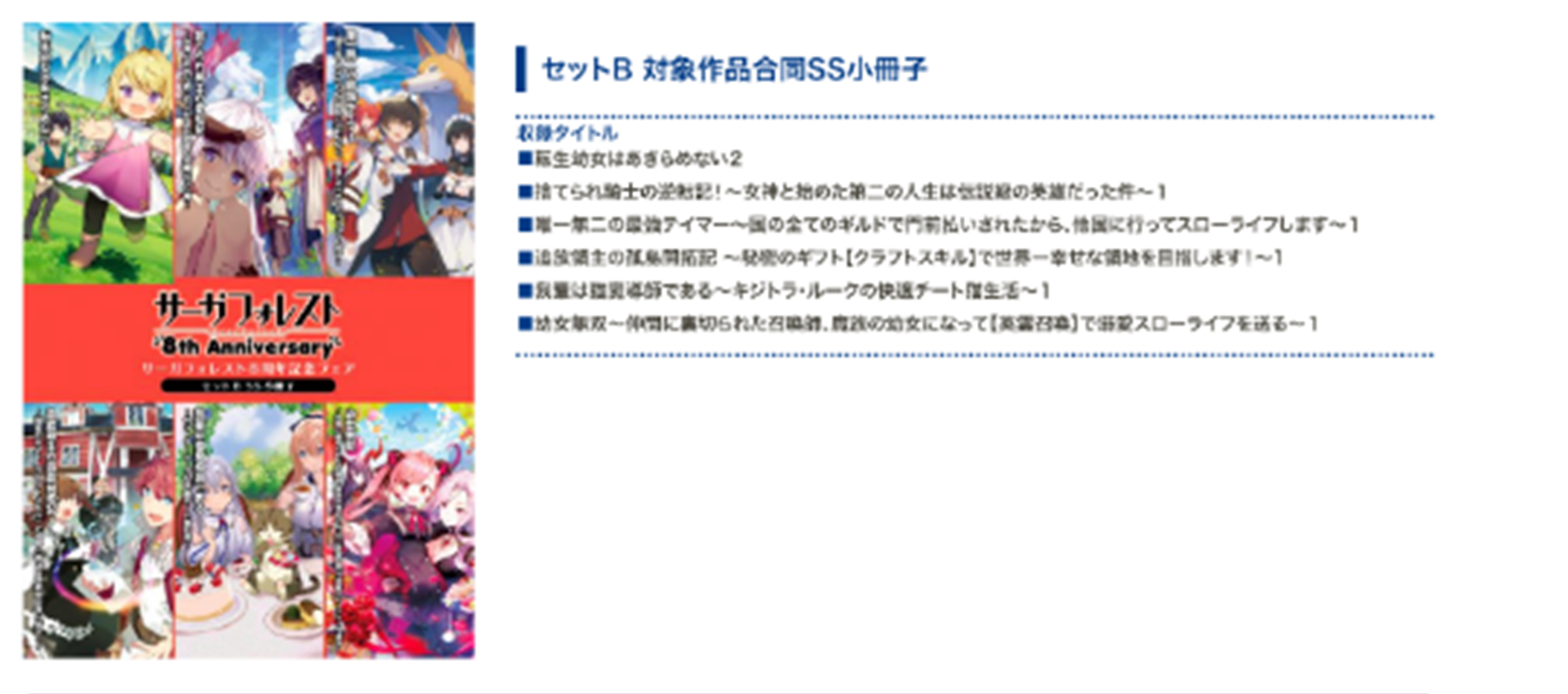 一二三書房では、ライトノベルやゲーム・アニメの書籍の製作・販売を数多く手掛けてまいりました。この度、一二三書房の主力エンターテインメント小説レーベルである『サーガフォレスト』が、読者皆様のおかげをもちまして、2023年6月15日に創刊8周年を迎えることとなりました。今回、この周年を記念して、各協力書店において、『サーガフォレスト創刊8周年記念フェア』を開催いたします。