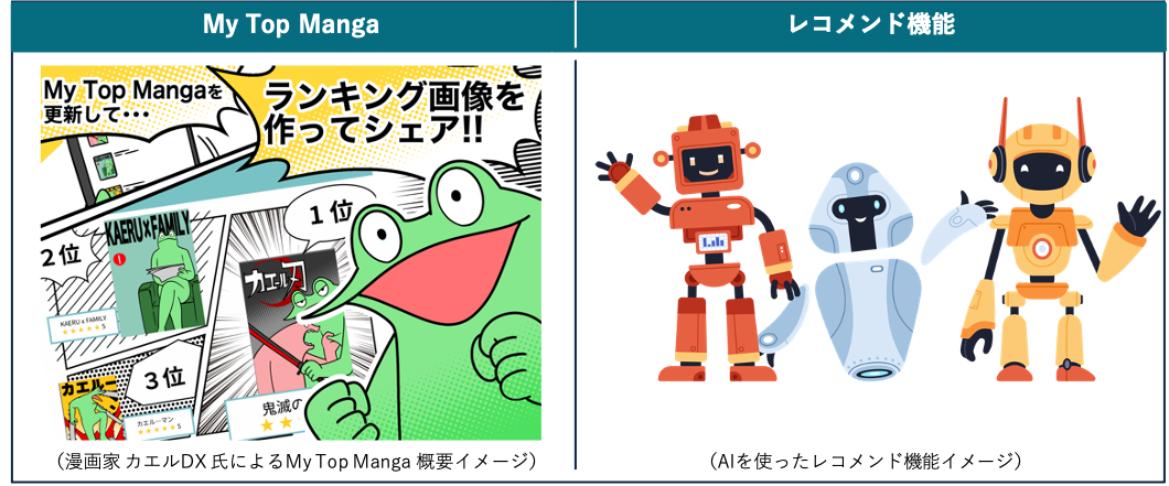 また、ユーザーは読んだ漫画の中から、お気に入りの漫画を選択して、ご自身の特別なランキング「My Top Manga」を制作することが出来ます。さらに、「読んだ漫画」「読みたい漫画」を登録すると、AIがユーザーにあった漫画を提案する「レコメンド機能」もご利用いただけます。