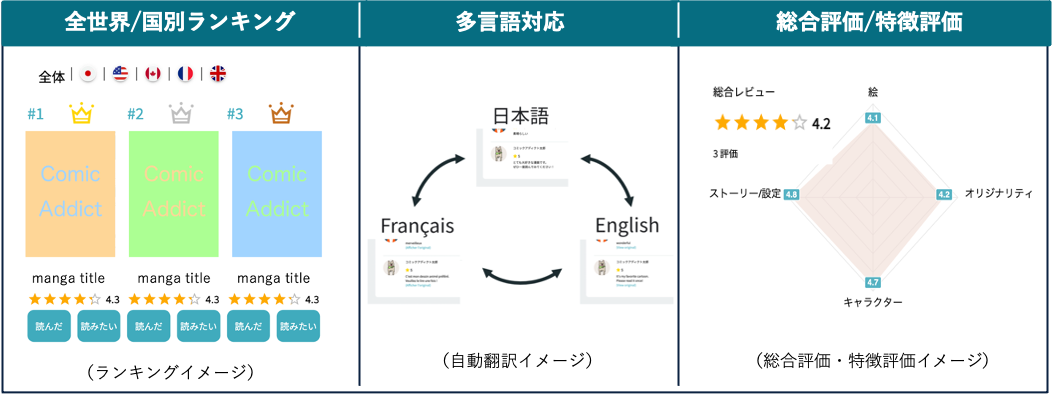 「ComicAddict」は、日本語、英語、フランス語に対応した無料で利用可能な漫画のレビューサイトで、利用者の居住地に合わせて表示言語が切り替わり、異なる言語で投稿された感想は、原文の他、自動翻訳で読むことが可能です。また、リアルタイムで200を超える国/地域ごとに人気の漫画を知ることが出来る仕組みになっており、世界で利用者が増えるにつれて、他では知ることが出来ないユニークな情報が手に入るWebサイトです。
