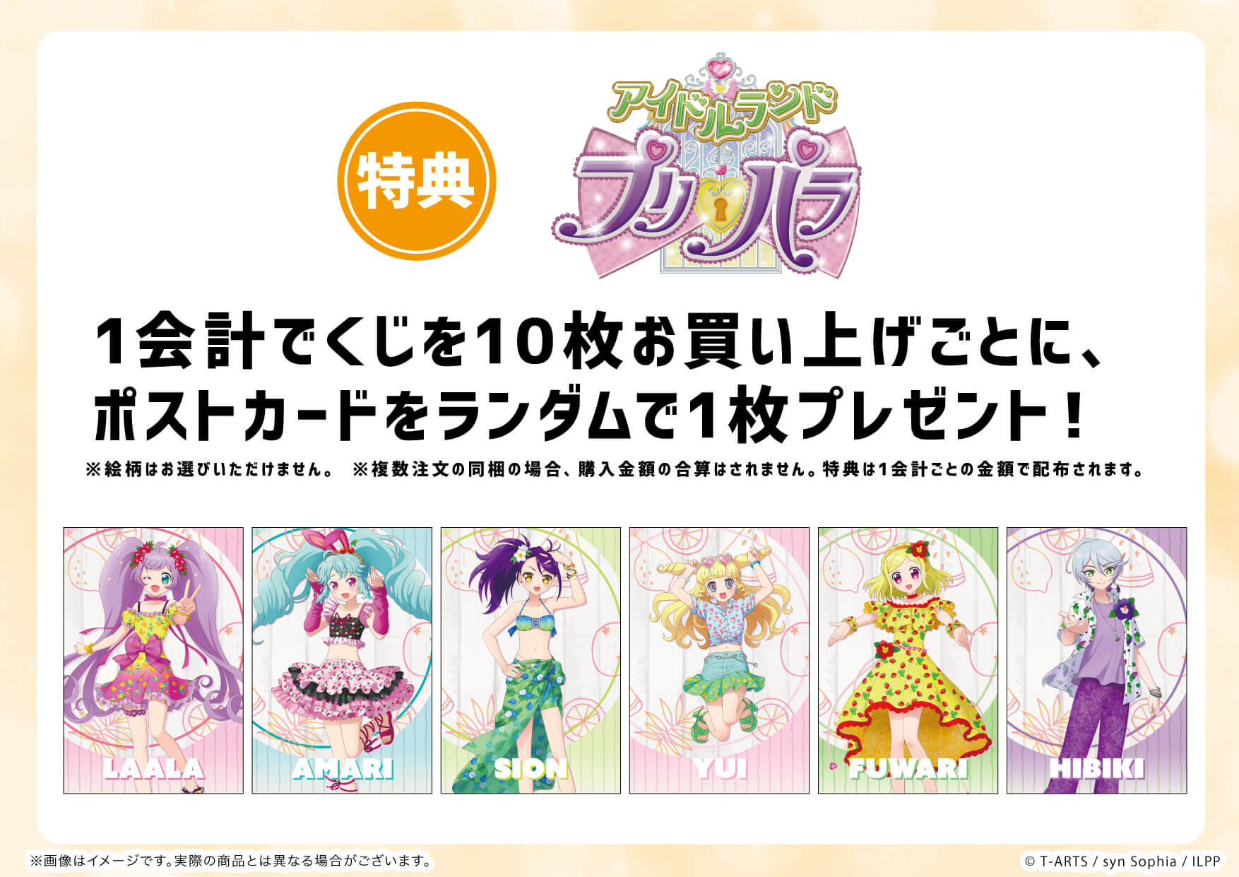 『アイドルランドプリパラ』の「eeoくじ」を1会計で10枚お買い上げいただいた方には、ポストカード(全6種)をランダムで1枚プレゼント♪
