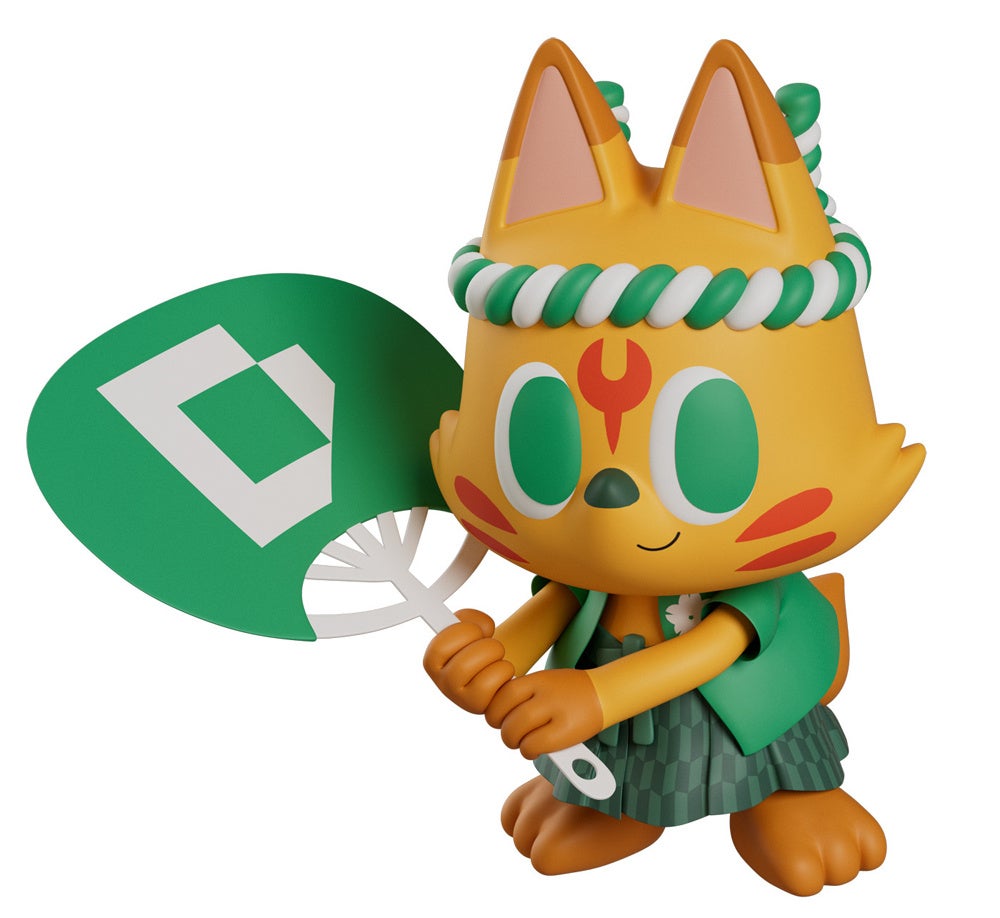 きつねをモチーフに、日本の祭りでよく見る大きな団扇を持ち、法被、袴に鉢巻と日本らしい衣装をまとったキャラクターです。