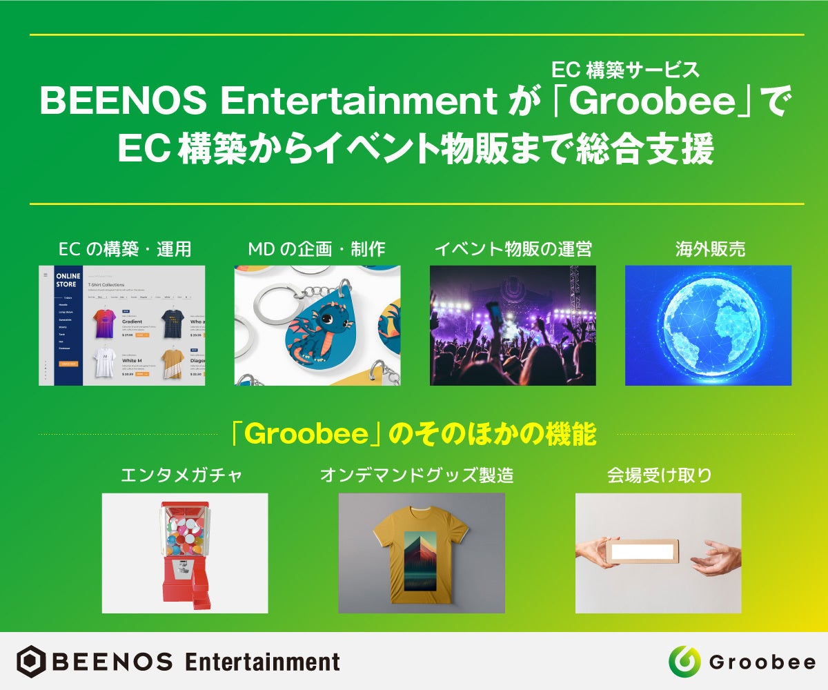 BEENOS EntertainmentはECサイトの構築から運営まで一気通貫でサポートするエンターテインメントに特化したサービス「Groobee」によってこれまでの多くのアーティストやタレント、キャラクターなどのECサイト、イベント物販、ファンクラブ運営を支援してまいりました。BEENOSグループの「日本から世界へ」、「世界から日本へ」と双方向をつなぐ越境EC支援事業で蓄積した知見とBEENOS Entertainment独自のエンタメDXのノウハウを組み合わせてエンタメコンテンツの流通拡大に最適な施策を提案しています。