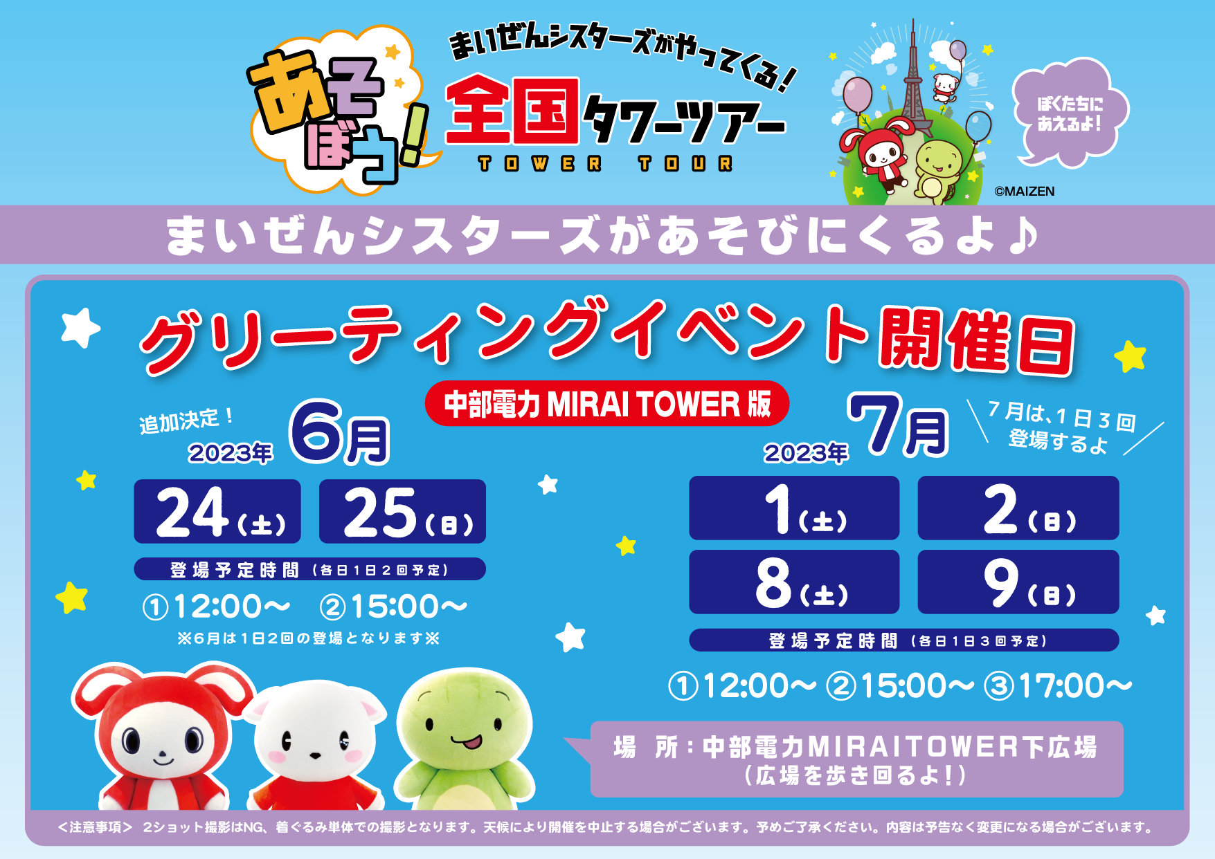 トラストトウキョウ株式会社(本社:東京都渋谷区)は中部電力MIRAI TOWERとまいぜんシスターズがコラボする『あそぼう!まいぜんシスターズがやってくる!〜全国タワーツアー』in 中部電力MIRAI TOWERを開催いたします。