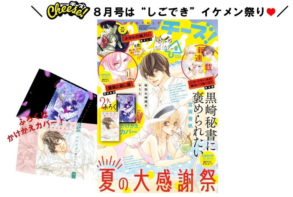 本日[2023年6月23日]発売の月刊少女漫画誌「Cheese!」8月号は、スパダリ上司との理想すぎるオフィスラブ『黒崎秘書に褒められたい』と、女子高生と殺し屋のバイオレンスアクション『薔薇と殺し屋』にフィーチャーした“しごでき”イケメン特集号!さらに、話題の明治殺し屋ロマン『ホタルの嫁入り』と『薔薇と殺し屋』の“殺し屋コラボ”企画も!