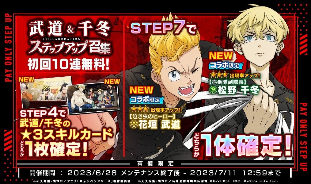 コラボ限定キャラクター[★3【無敵のマイキー】佐野万次郎] 、[★3【戦況を変える男】龍宮寺堅]の出現率がアップする「コラボ召集」を開催します。