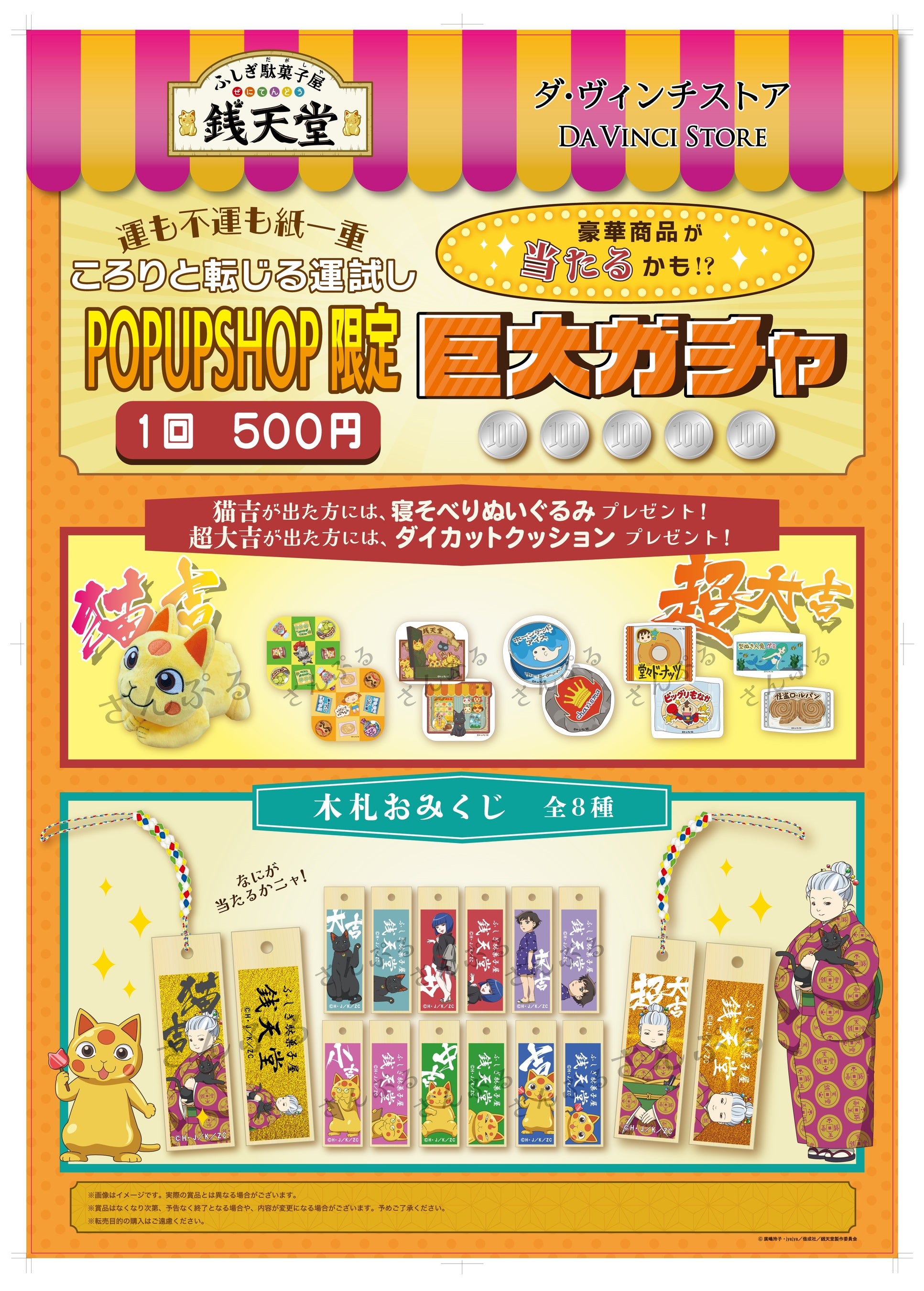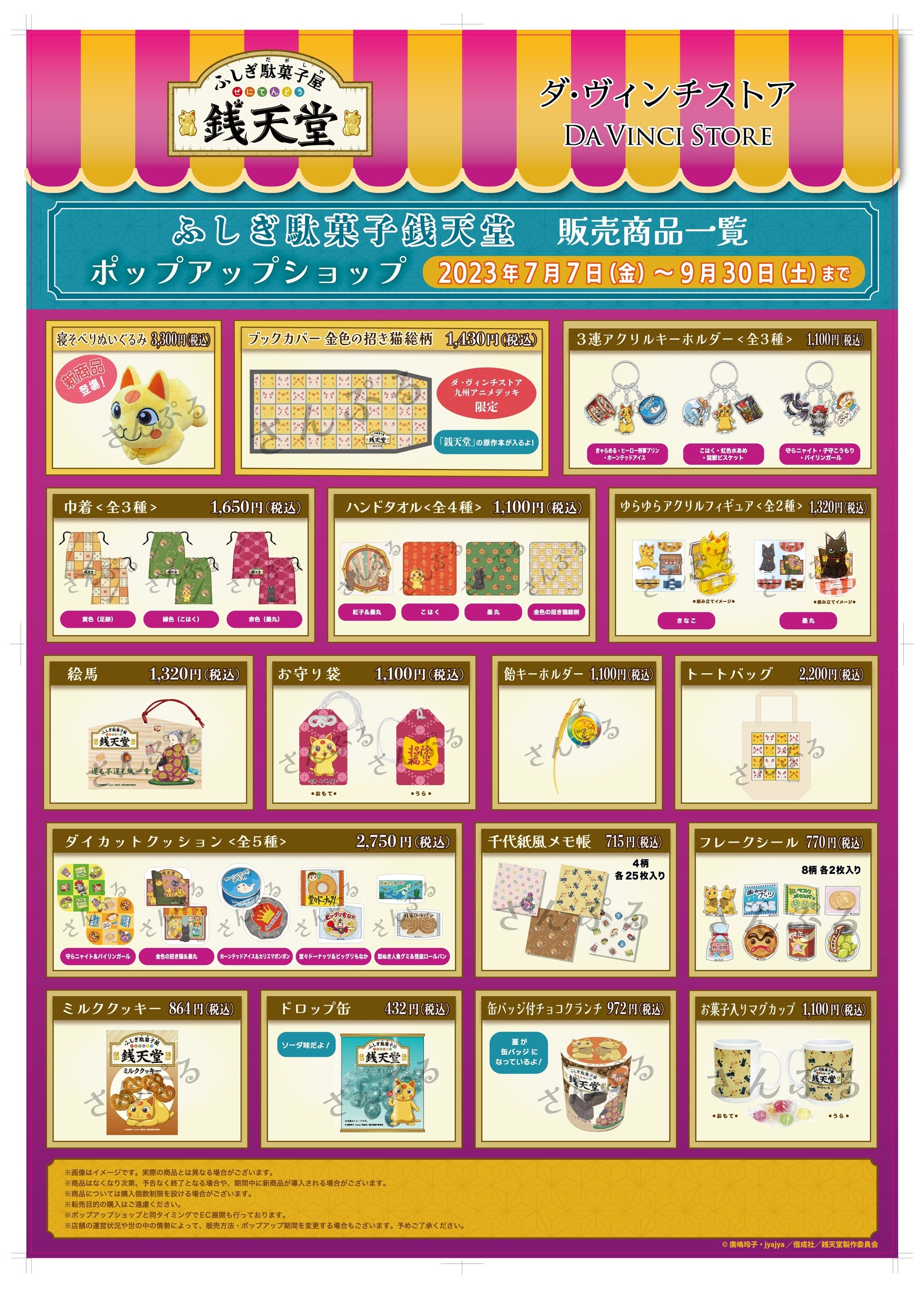 ダ・ヴィンチストア及び九州アニメデッキでしか手に入らないポップアップショップ限定の「銭天堂」原作本が入るブックカバーを販売、また、新たに寝そべりぬいぐるみも登場します。その他、駄菓子をモチーフにしたダイカットクッションや、金色の招き猫がデザインされたゆらゆらアクリルスタンド、缶バッジ付きチョコクランチなど、多数の商品を販売します。