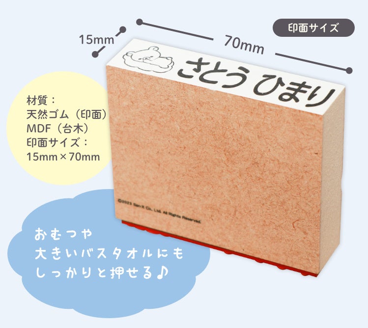 印面サイズは15×70ミリ。女性の手でも持ちやすい大きさでありながら大きめの文字ではっきりと読みやすく、保育園生活で毎日大量に名前を書かないといけないおむつはもちろん、お道具袋やバスタオルなどにもご使用OK。持ち手にはMDFという環境にやさしい再生材を使っています。