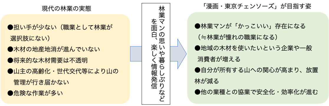 今後、森林の価値を最大化して産業として発展させていくためには、一般の方への木材需要の喚起や担い手の確保、また他の産業との協業が必須であり、そのための第一歩としてまずは「林業」という職業をもっと身近に感じてもらうことが必要だと考え、「漫画・東京チェンソーズ」の企画を立ち上げました。