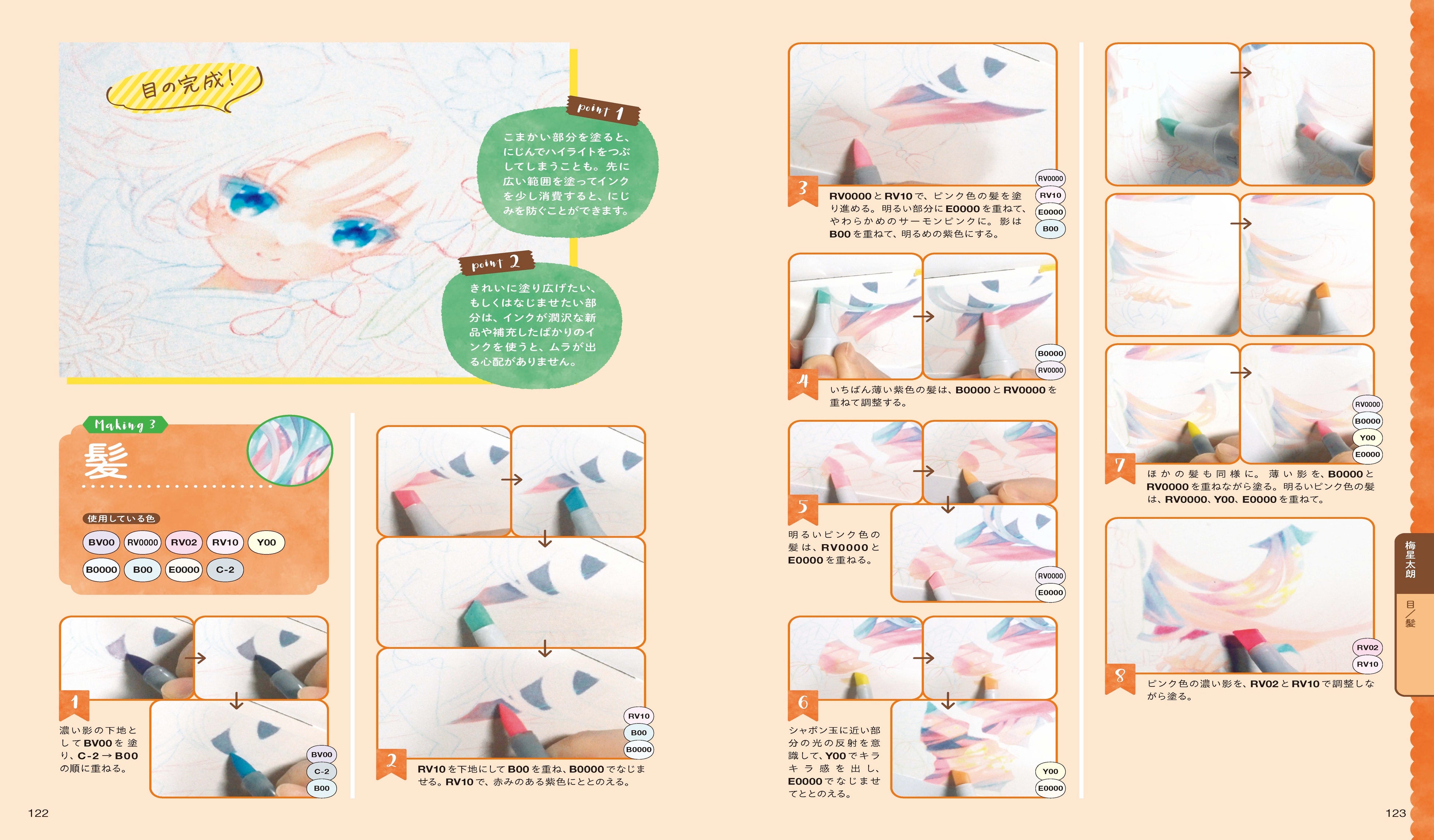 本書では、「ぼかし」「グラデーション」「重ね塗り」といった基本テクニックから、人気絵師4名のスーパーテクニックを惜しみなく紹介しています。基本の9つのテクニックにはQRコードがついており動画を見ることができます。