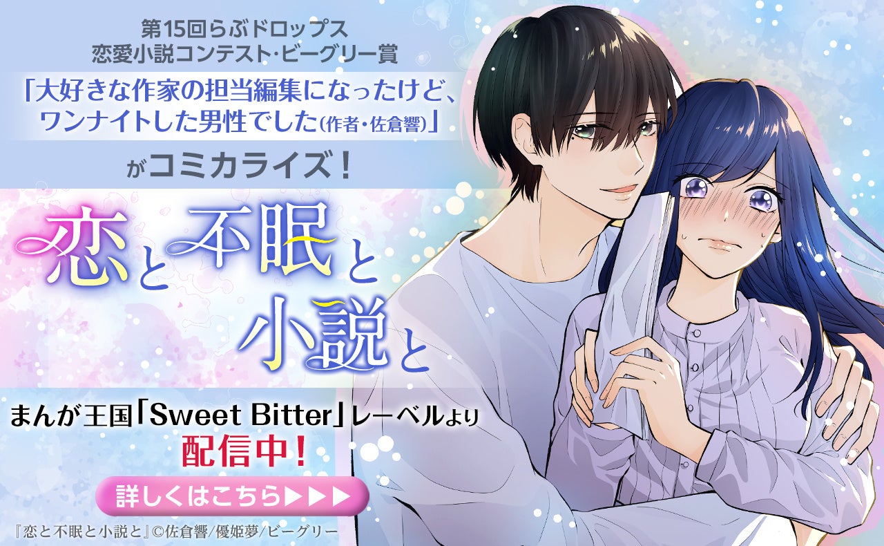 このたび、配信を開始した「恋と不眠と小説と」の原作となった小説(元タイトル:「大好きな作家の担当編集になったけど、ワンナイトした男性でした」)は、小説投稿サービス『ノベルバ』において、株式会社パブリッシングリンクと共同で開催した「第15回らぶドロップス恋愛小説コンテスト」でビーグリー賞に輝いた作品のひとつです。本作は『まんが王国』にて、大人の恋愛をお届けするコミックレーベル「Sweet Bitter」より配信いたします。