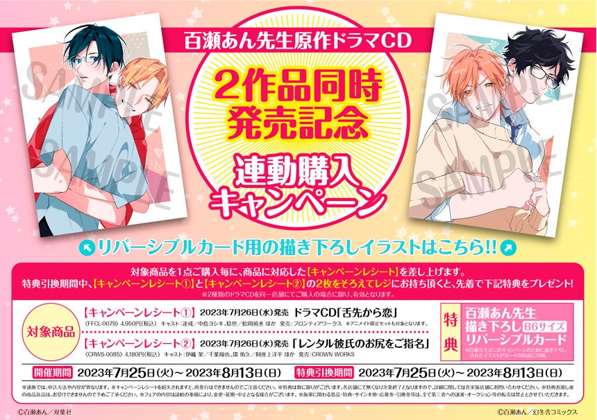 百瀬あん先生原作ドラマCD「舌先から恋」、「レンタル彼氏のお尻をご指名」の2タイトル同時発売を記念して、全国アニメイト、アニメイト通販にて、このドラマCDの連動購入キャンペーンを実施致します!