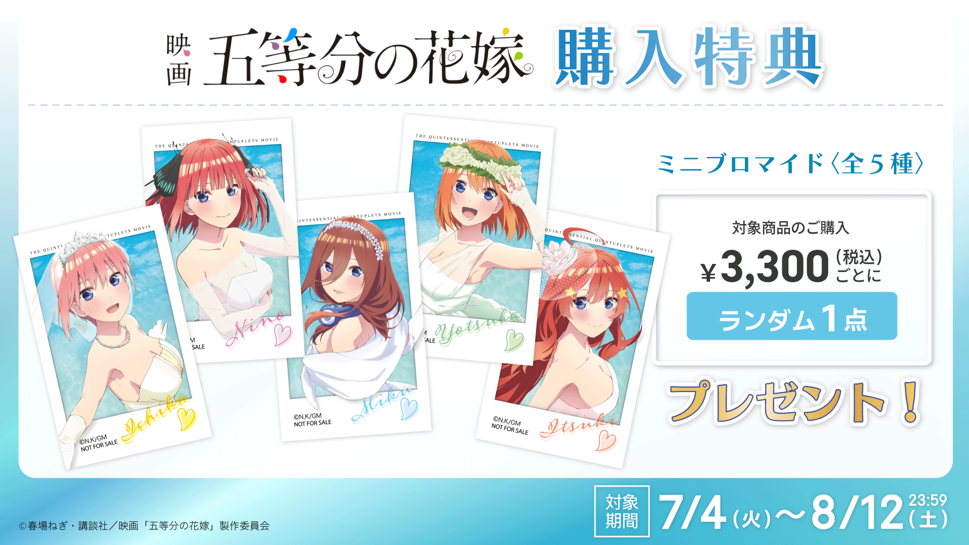 販売期間中(2023/7/4~8/12)、アニメシリーズ『五等分の花嫁』の合計注文金額3,300円(税込)お買い上げごとにランダムで特典(全5種)を1枚、13,200円(税込)お買い上げごとに特典(全5種セット)を1セットプレゼントいたします。