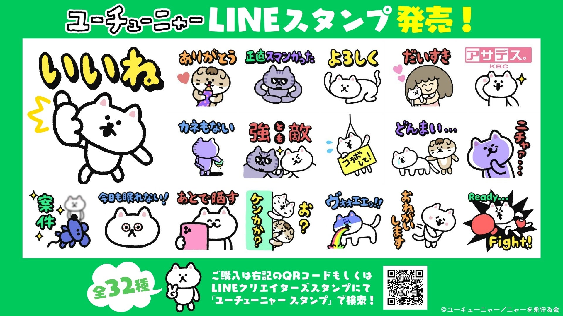 現在、九州朝日放送「アサデス。KBC」内ほかにて放送・Youtubeほかにて配信中のオリジナルTVアニメ『ユーチューニャー』がかわいいLINEスタンプに!!