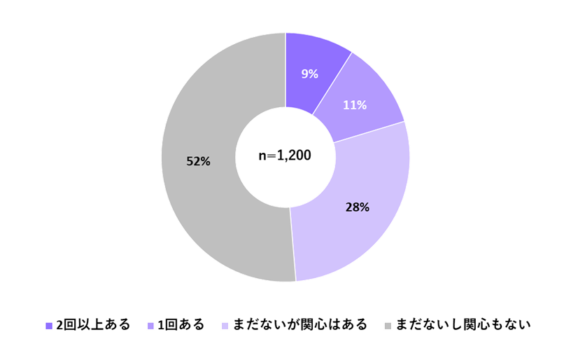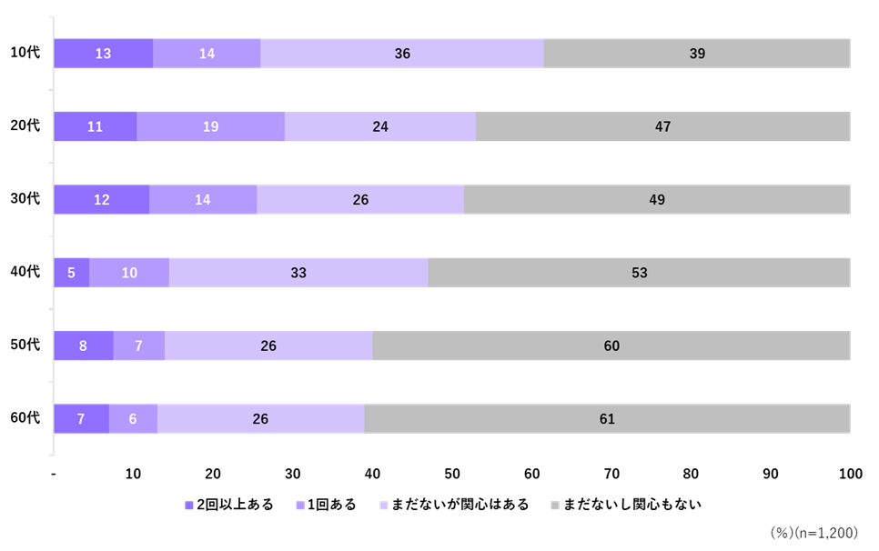 ロケ地巡りやアニメの聖地巡礼の経験について、「2回以上ある」が9%、「1回ある」が11%だった。「まだないが関心はある」は28%となり、経験者と合わせると48%が関心を持っている。年代別でみると、10代の関心が63%で最も高い。