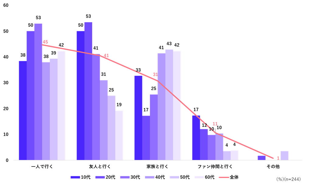 ロケ地巡りやアニメの聖地巡礼をする時の同行者について複数回答で聴取したところ、「一人で行く」が全体で45%と最も高い。特に20代と30代で高く約50%だった。また「友人と行く」は、10代と20代でそれぞれ約50%となった。