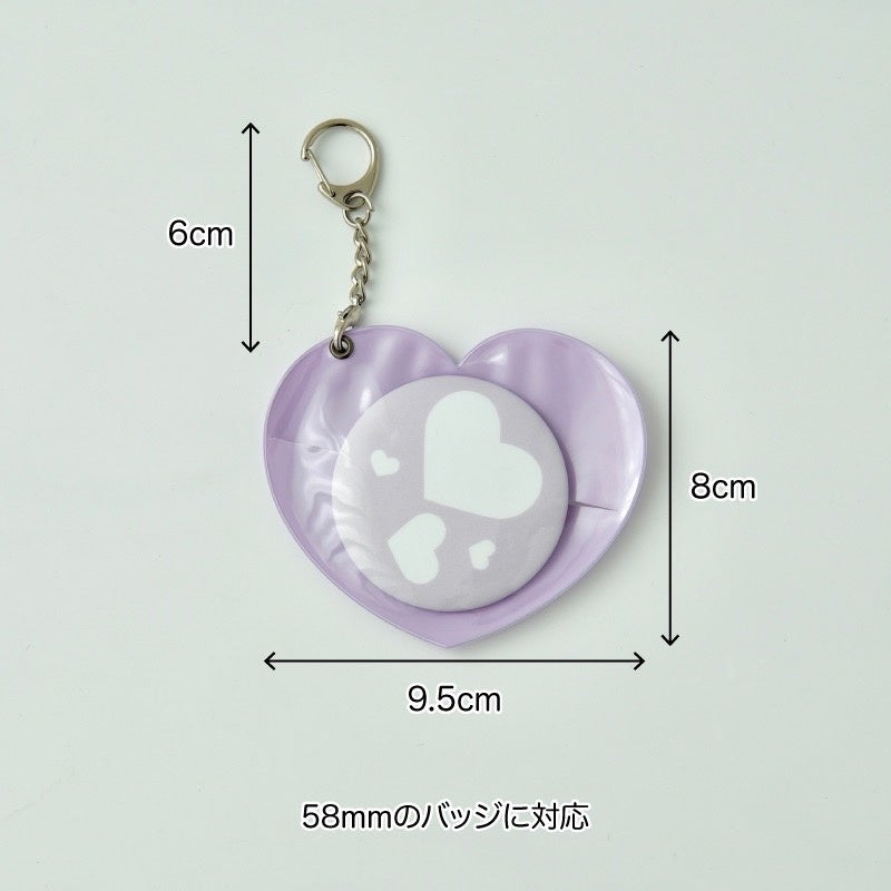 ハート型の缶バッジ保護ケースです。普通の丸いバッジもハートのシルエットに変わります。前面はクリア素材でしっかり推しが見え、防水なので雨の日でも安心です。ストラップ代わりにいつものバッグに付けても持ち歩けます。