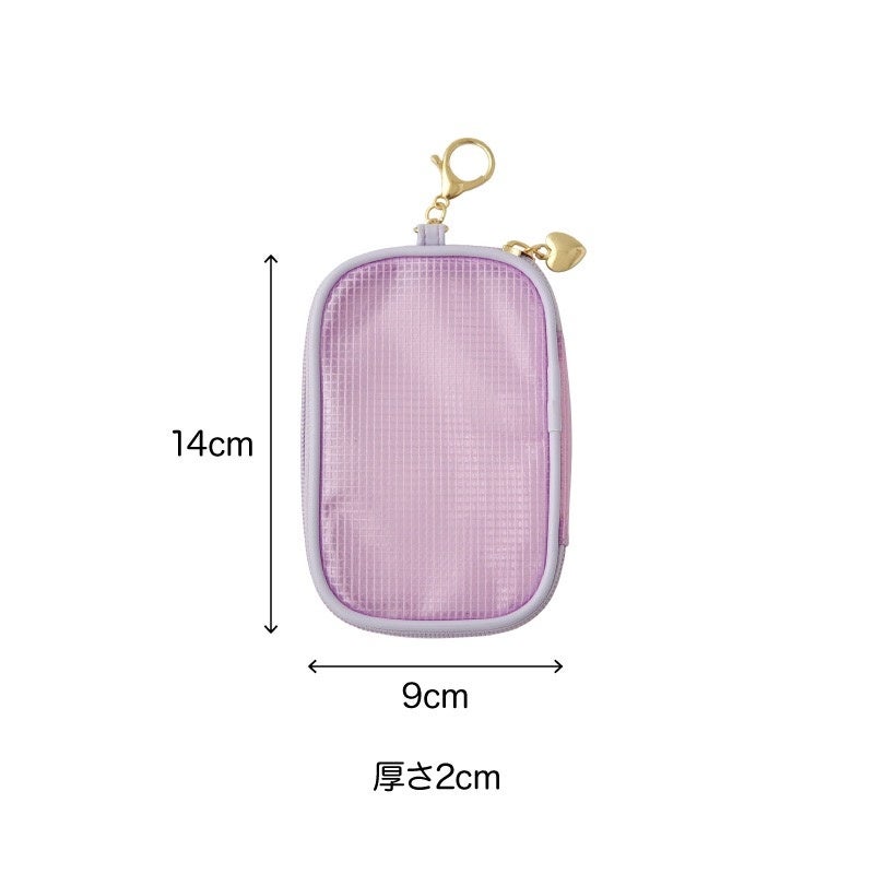 コンパクトなサイズ感のクリアポーチです。全面がクリアなので推しグッズなどを詰めたお気に入りの世界観の表現にも、シンプルな見た目を生かして日常小物の収納にもお使いいただけます。付属の金具でバッグに取り付けも可能です。