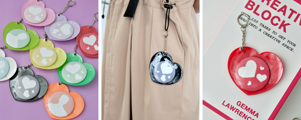 ハート型の缶バッジ保護ケースです。普通の丸いバッジもハートのシルエットに変わります。前面はクリア素材でしっかり推しが見え、防水なので雨の日でも安心です。ストラップ代わりにいつものバッグに付けても持ち歩けます。