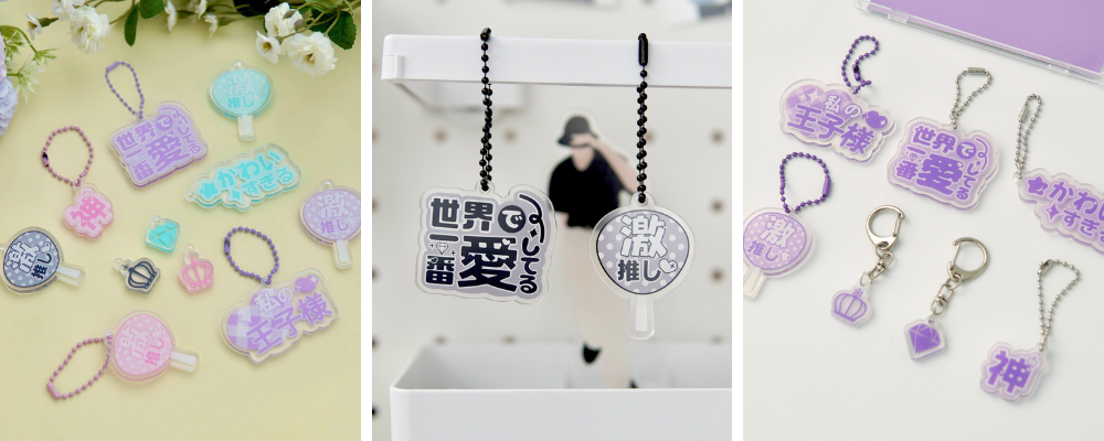 推し活にぴったりのポジティブなワードを揃えたアクリルチャームです。単体でも、グッズと重ね付けしても可愛く、推しの魅力を引き立てます。