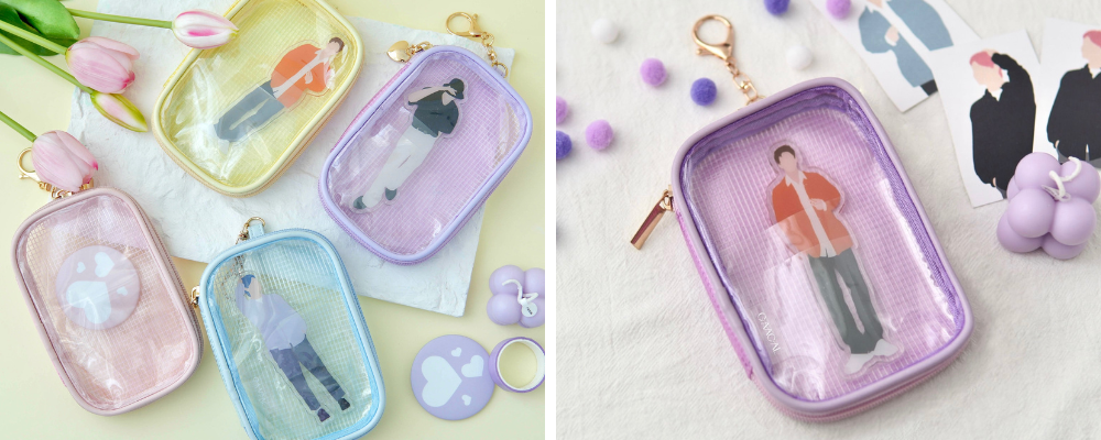 コンパクトなサイズ感のクリアポーチです。全面がクリアなので推しグッズなどを詰めたお気に入りの世界観の表現にも、シンプルな見た目を生かして日常小物の収納にもお使いいただけます。付属の金具でバッグに取り付けも可能です。