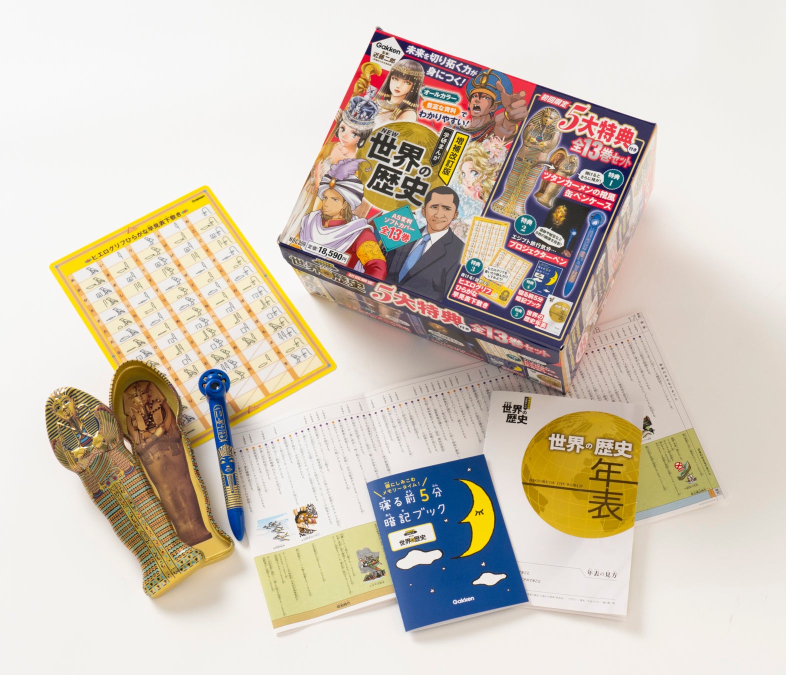 初回限定版セットには、「ツタンカーメンの棺風缶ペンケース」や、エジプトの遺跡や秘宝などの8枚の画像が投影できる「プロジェクターペン」、自分の名前が書ける「ヒエログリフひらがな早見表下敷き」、暗記ブックや歴史年表といった、豪華な5大特典が付属!