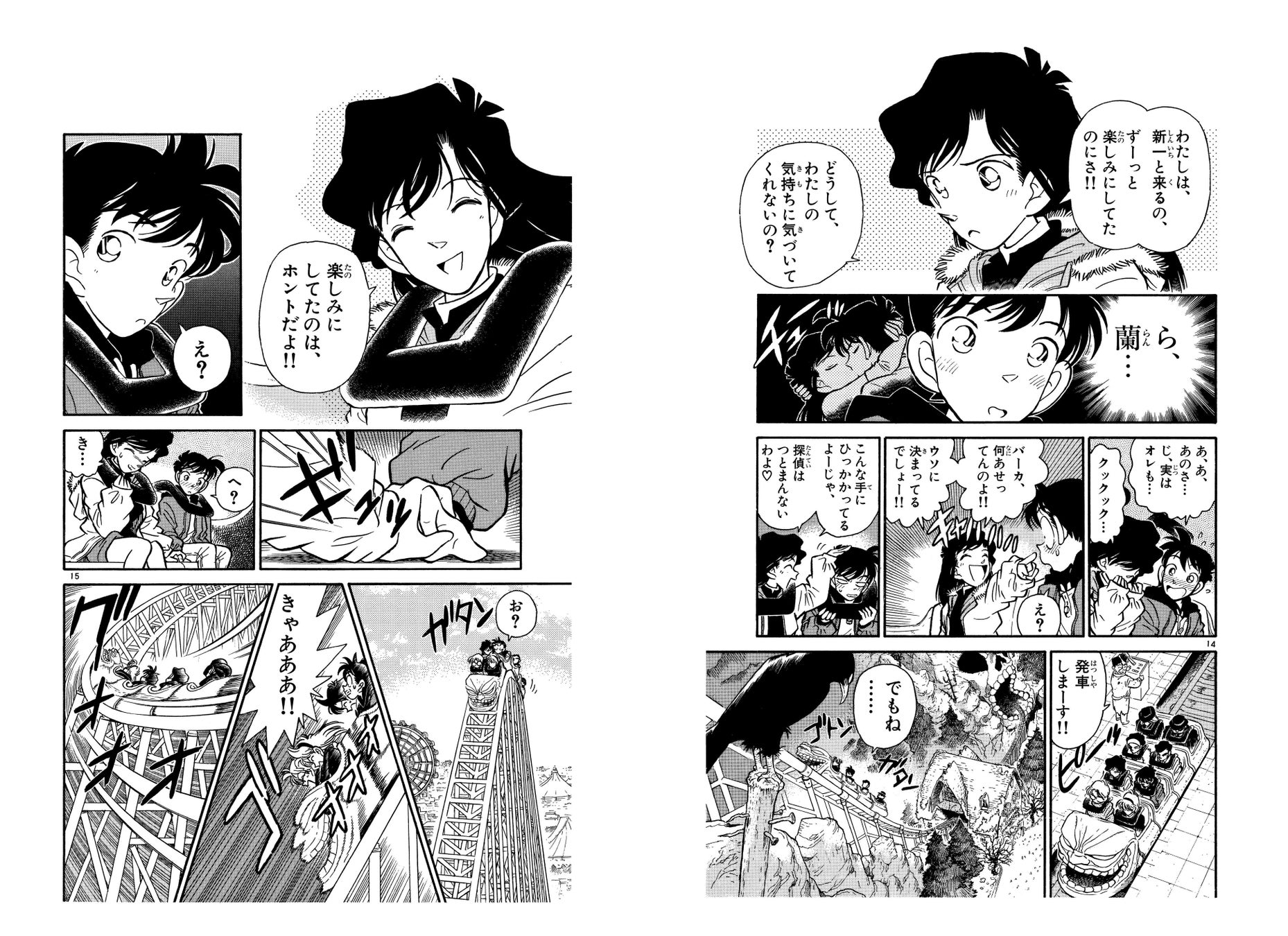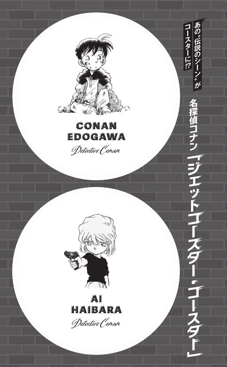 コースターの表面には本作のキーパーソンであるコナンと灰原が掲載。さらに裏面には新一&蘭、ジン&ウォッカがジェットコースターに乗ったシーンが描かれたコースターとなっています。裏面には他にも蘭、灰原、黒ずくめの組織たちの名シーンも掲載。表裏どちらもコースターとして使えるので、“1枚で2度楽しめる”付録です。