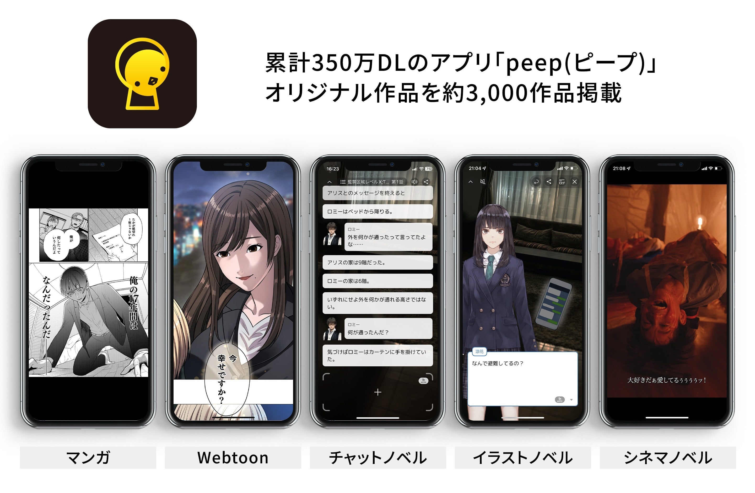 peepではマンガ・ノベルなどのオリジナル作品約3,000作品を展開しており、読者数は累計100万名を超える作品もあり、350万ダウンロードを突破するなど24歳未満のZ世代を中心に人気を集めています。当初「チャットノベル」の掲載から始まったpeepは、今では「マンガ」や「Webtoon」「シネマノベル」「イラストノベル」といった様々なカタチのエンターテインメント作品を掲載するメディアへと進化しています。サービスを運営していく中で生まれたヒットノベル作品は、taskey STUDIOでコミカライズ(マンガ化・Webtoon化)され、多数の連載作品がpeepやその他サービスで掲載されています。