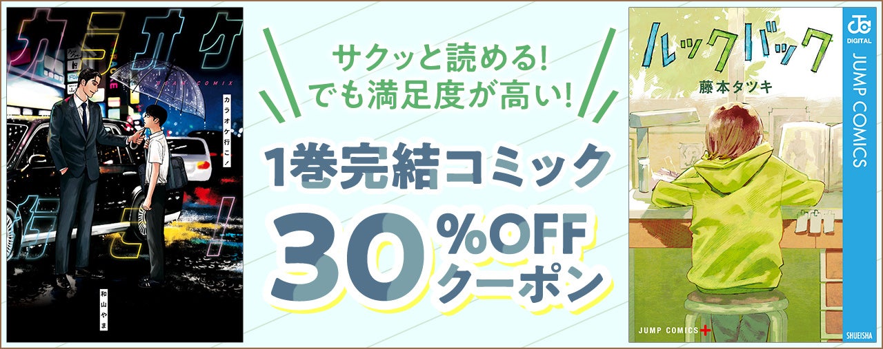 1巻完結コミック(単巻コミック)や短編集は、さくっと気軽に読めて、満足度が高い作品ばかり! まず読んでおいて間違いない作品、映画化やSNSで話題となった作品、人気シリーズを描く先生の短編集など、長編とは違った魅力がある作品を特集いたします。また、『カラオケ行こ!』『ルックバック』『家が好きな人』などの人気作品をはじめ、特集内の対象作品に使える30%OFFクーポンも配布いたします。