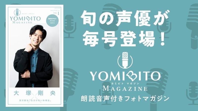 「YOMIBITO MAGAZINE」は、毎号一人の声優をピックアップするボイス&フォトマガジンで、声優による名作文学の朗読音声と、撮り下ろし写真、インタビューテキストなどをたっぷり収録しています。第1号には、TVアニメ『【推しの子】』アクア役や『SYNDUALITY Noir』カナタ役、『AIの遺電子』須堂 光役などで活躍する大塚剛央が登場。宮沢賢治の名作『注文の多い料理店』の朗読、スタジオでの撮り下ろし写真やロングインタビュー、そして動画メッセージを通して声優・大塚剛央の魅力に迫ります。