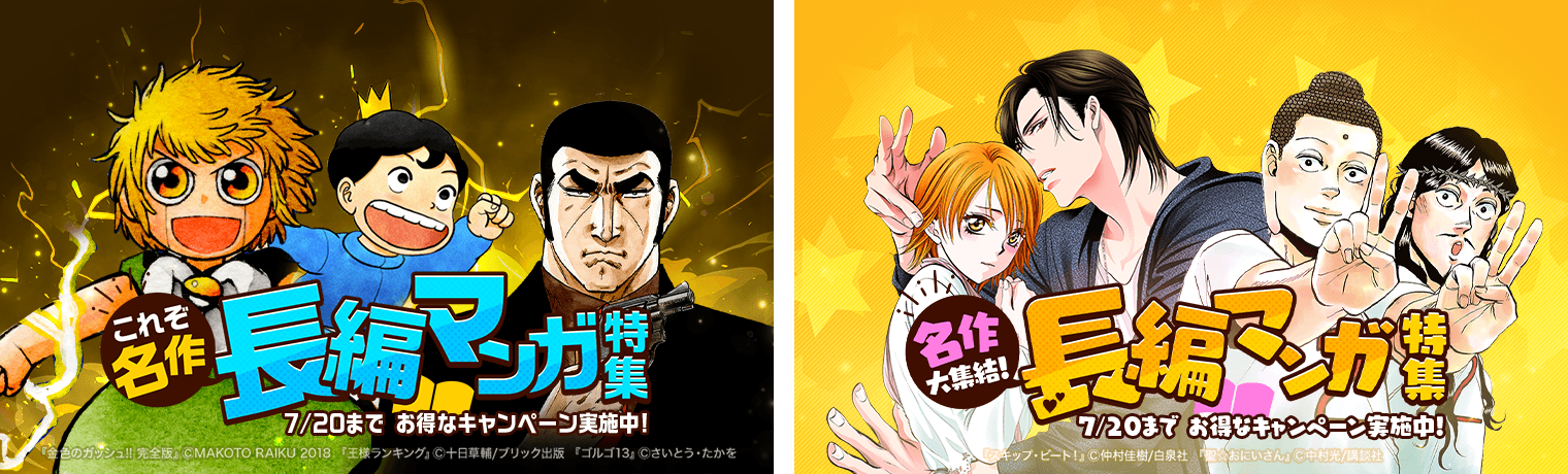 今回の特集では、『金色のガッシュ!! 完全版』(BIRGDIN BOARD Corp.)、『王様ランキング』(ブリック出版)、『ゴルゴ13』(リイド社)や、『スキップ・ビート!』(白泉社)、『聖☆おにいさん』(講談社)など、大人気の長編マンガを多数取り揃えています。