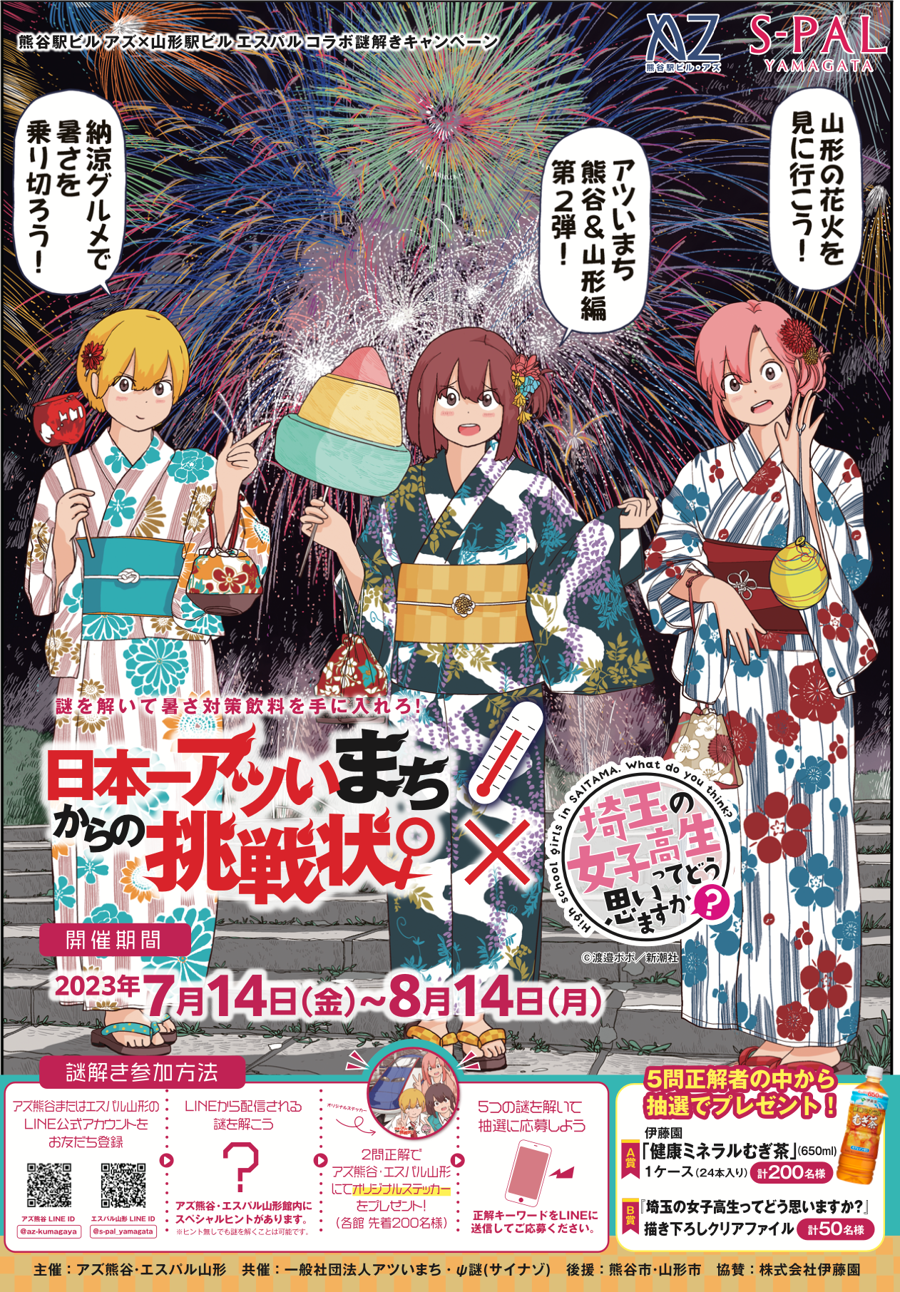 一般社団法人アツいまち(本社:岐阜県多治見市 代表理事:中島 雄平)は、2023年8月14日(月)まで主催:アズ熊谷(高崎ターミナルビル株式会社)、エスパル山形(仙台ターミナルビル株式会社)、共催:株式会社伊藤園と共に謎解きキャンペーン「日本一アツいまちからの挑戦状」を各駅ビルのLINE公式カウントで開催致します。本キャンペーンでは、日本の歴代最高気温の記録を持つ熊谷市と山形市が、暑さ対策先進都市として謎解きを使い「住みやすいまちづくり」につながる暑さ対策や地域イベント、特産品を楽しく発信しています。