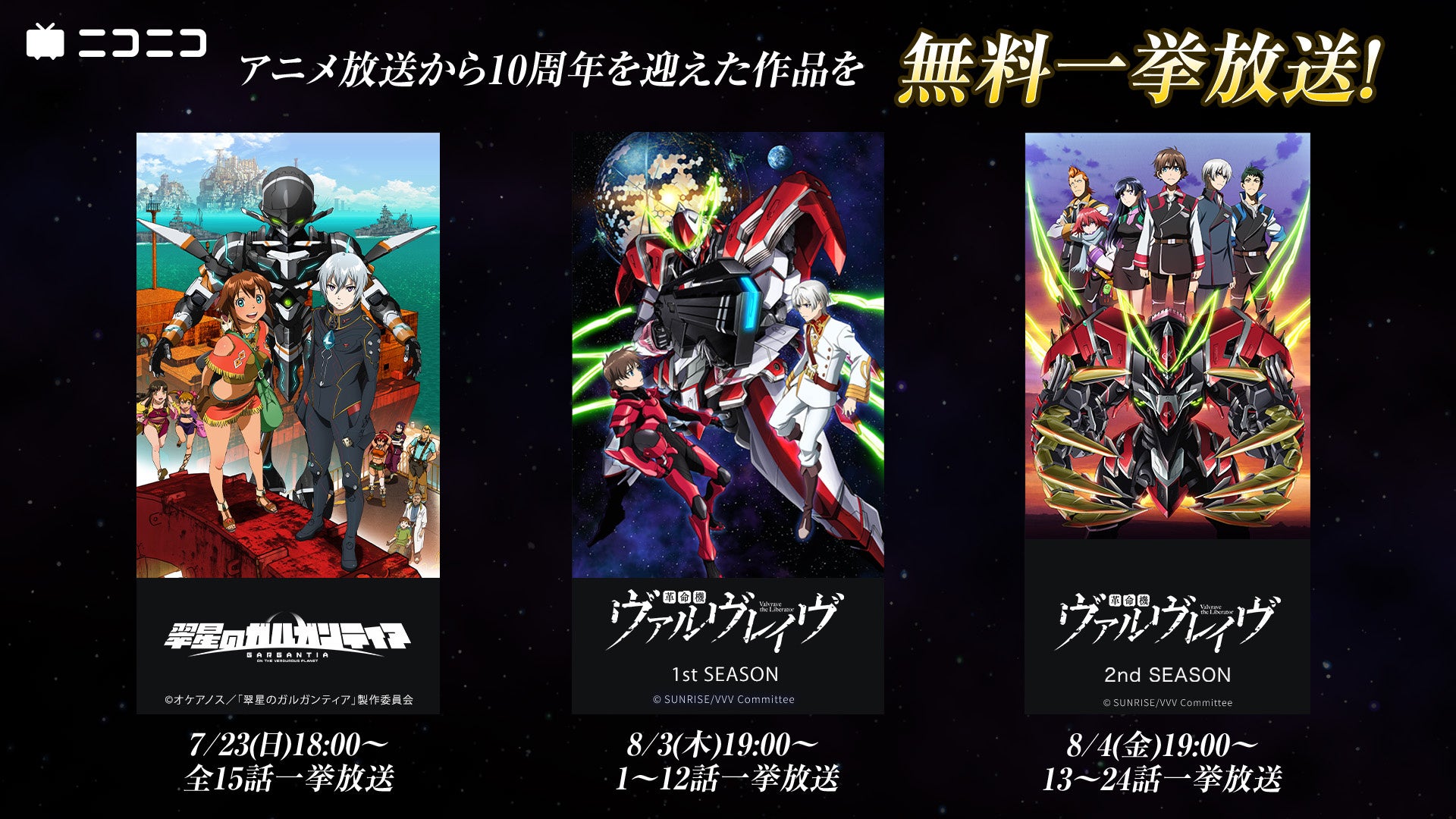 ニコニコ生放送にて、アニメ放送から10周年を迎えた「翠星のガルガンティア」「革命機ヴァルヴレイヴ」を無料一挙放送致します。
