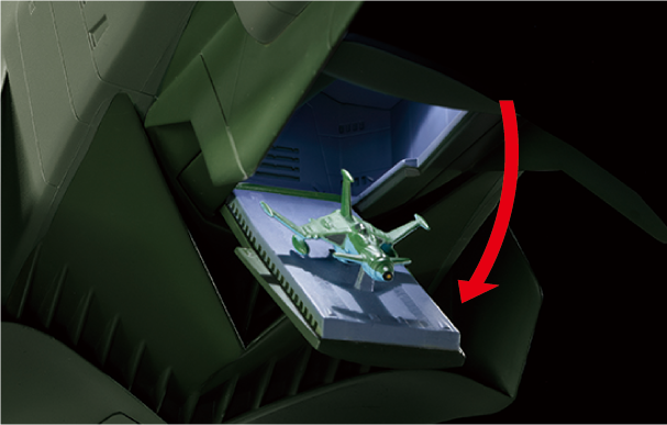 艦底部のハッチが開き、内部照明が点灯します。ハッチには艦載機スペースウルフをセットすることができます。