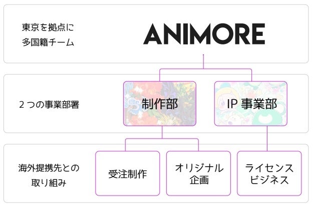 Animoreはアニメーション制作や日中のキャラクターIPプロデュース・運営を行う企業です。日本と中国の合作プロジェクトに関わってきた陳龑(チンエン)がメンバーを集め、2022年8月に「Animore株式会社」を設立しました。チームは多国籍な人材で構成され、日本を拠点にアニメ制作から商品企画、イベント企画まで幅広く行います。