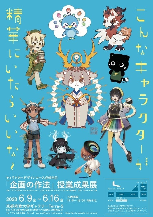 この展示企画は、京都精華大学マンガ学部キャラクターデザインコースの生徒たちが、必修科目の「企画の作法」の実習授業の中で、教員の指導の元、グループ内の役割分担、スケジュールの考慮、そして調査と分析を行った上でオリジナルキャラクターの企画を立てた成果展です。