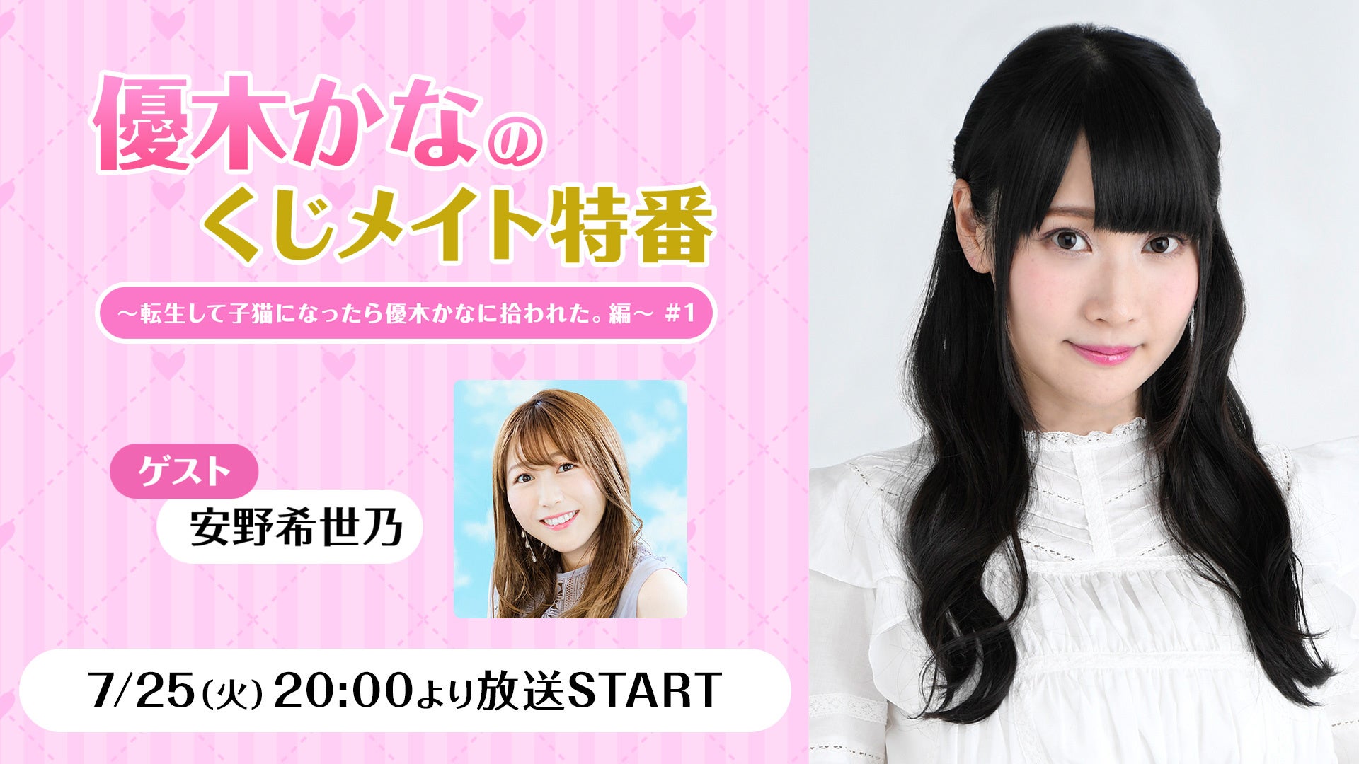 7月25日(火)放送の優木かなのくじメイト特番「転生して子猫になったら優木かなに拾われた。編」#1は、アニメイトのオンラインくじサービス「くじメイト」において、優木かなさんのくじメイトが発売されたことを記念して行われる特別番組です。