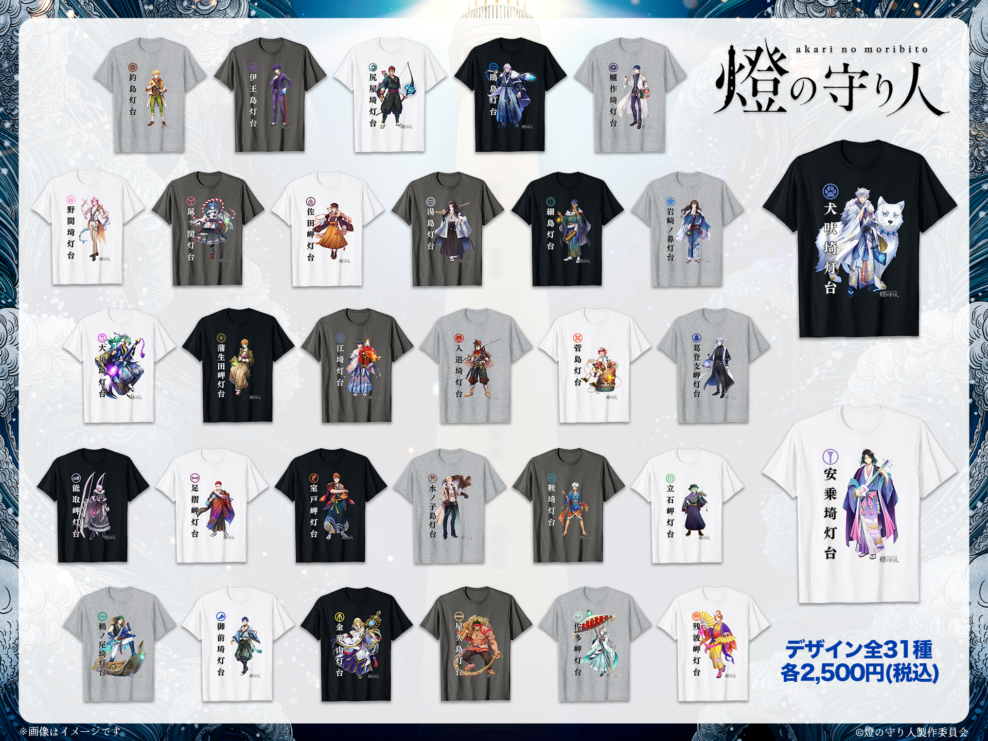 Amazon Merch on Demand(アマゾン マーチオンデマンド)にて先月より販売され、その美麗なイラストと大胆なデザインが話題となった『燈の守り人』キャラクターTシャツシリーズ。今回、新たなラインナップとして追加されたのは、先日キャラクター公開されたばかりの安乗埼灯台(三重県)を含む31灯台です。これにより、先月、発売された10灯台と合わせて、現在公開されている全41灯台のキャラクターTシャツが出揃いましたので、この機会にぜひ、”推し灯台”のキャラクターTシャツをお買い求めください。