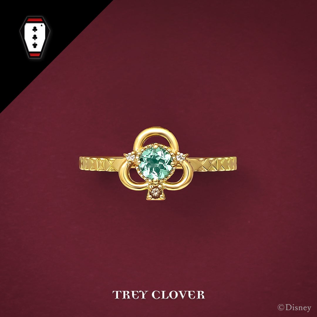 トランプのクローバーで「トレイ・クローバー」を表現しました。輝く3石のストーンで3(トレイ)を表し、メインストーンは鮮やかなグリーンクォーツでトレイらしいカラーリングに仕上げています。正面はチェック柄、側面は王冠風のデザインが施されたアームがハーツラビュル寮らしいデザインです。