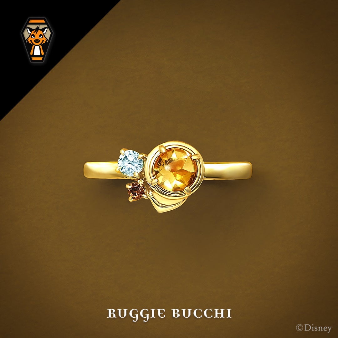 「ラギー・ブッチ」を表現したシトリンにバンダナのデザインを加え、遊び心のあるリングに仕上げました。バフトップカットを施したシトリンはツヤときらめきが共存する豊かな表情を楽しむことができます。2石のカラーストーンは瞳の色と好物のドーナツをイメージ。アーム側面には寮服をイメージしたパターンを施し、サバナクロー寮らしさをプラスしました。