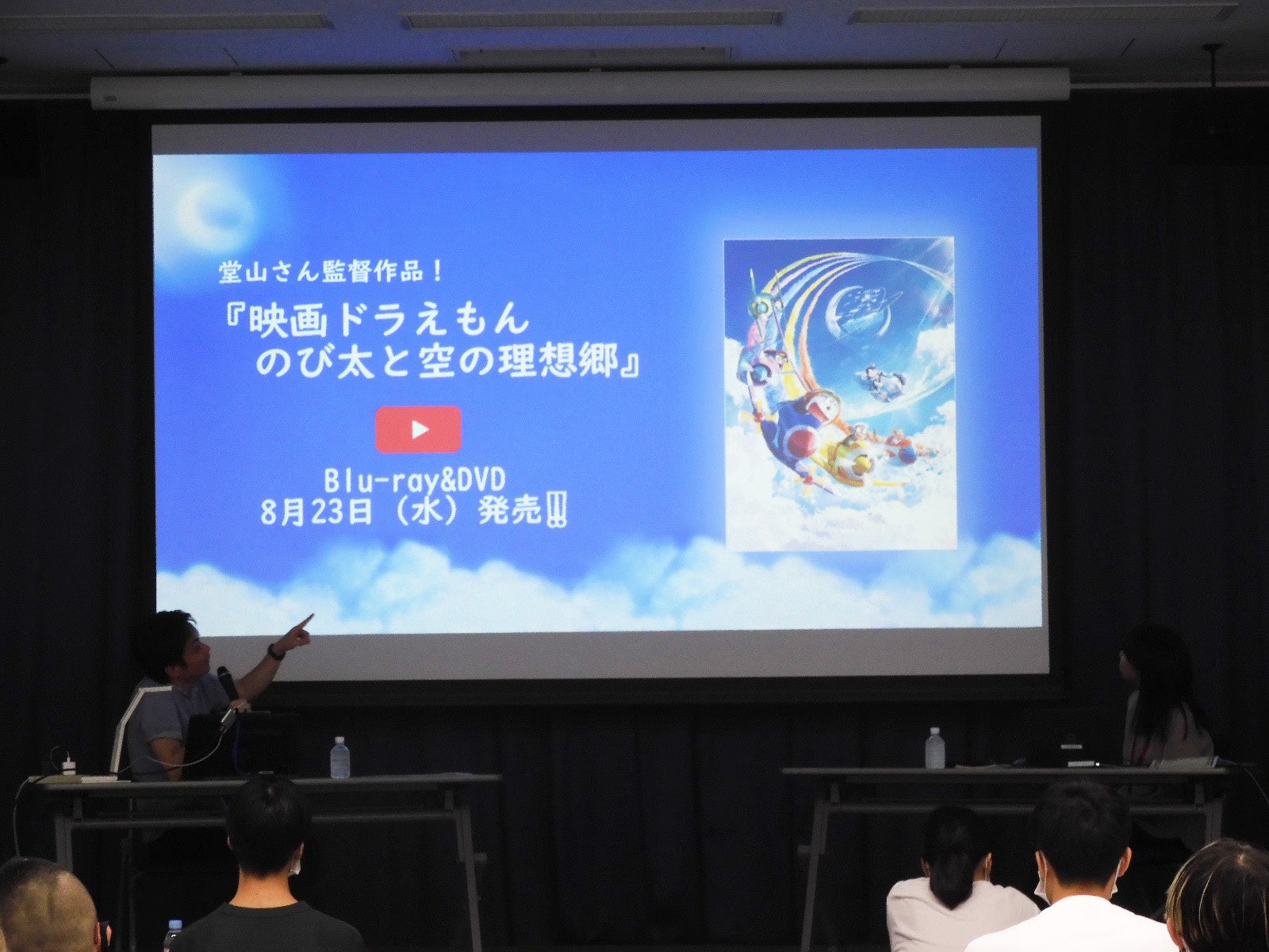 まずは、2023年3月に劇場公開されたばかりの『映画ドラえもん のび太と空の理想郷』の予告編の映像を参加者の皆さんと視聴。その後、堂山さんから「非常にたくさんの方に観ていただいた作品です。子どもはもちろん、ドラえもんってすごく幅の広い層の方に観られる作品ですが、今回の映画では脚本のテーマをどうやってドラえもんの映像に落とし込むか考えるのが大変でした」と、制作エピソードについてお話しいただきました。