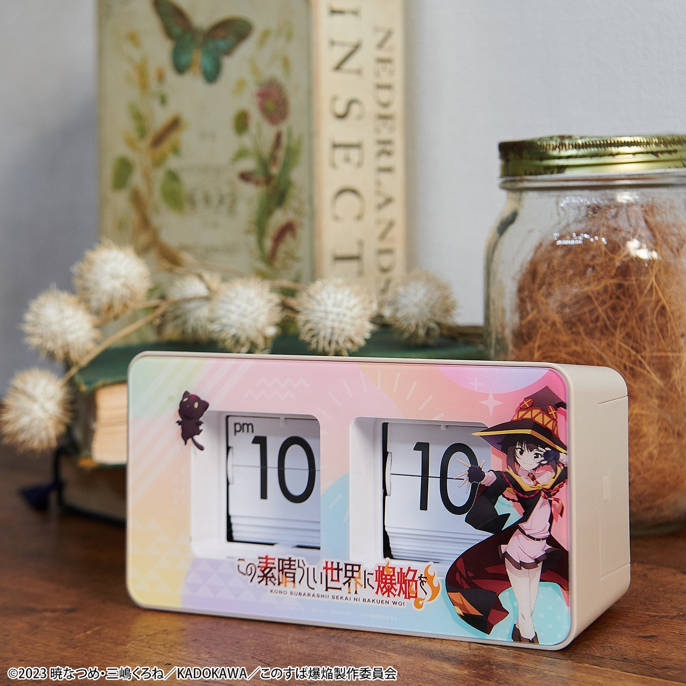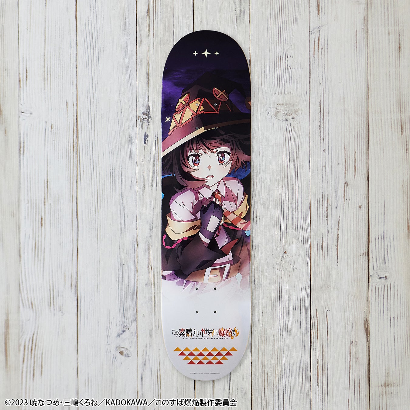 今回、予約を開始する商品は、『この素晴らしい世界に爆焔を!』のティザービジュアルを高さ801×横203mmという大きなデッキにプリントしたスケートボードデッキ(全1種)と、パタパタと時を刻むレトロデザインもオシャレなフリップクロック(全1種)の2商品です。