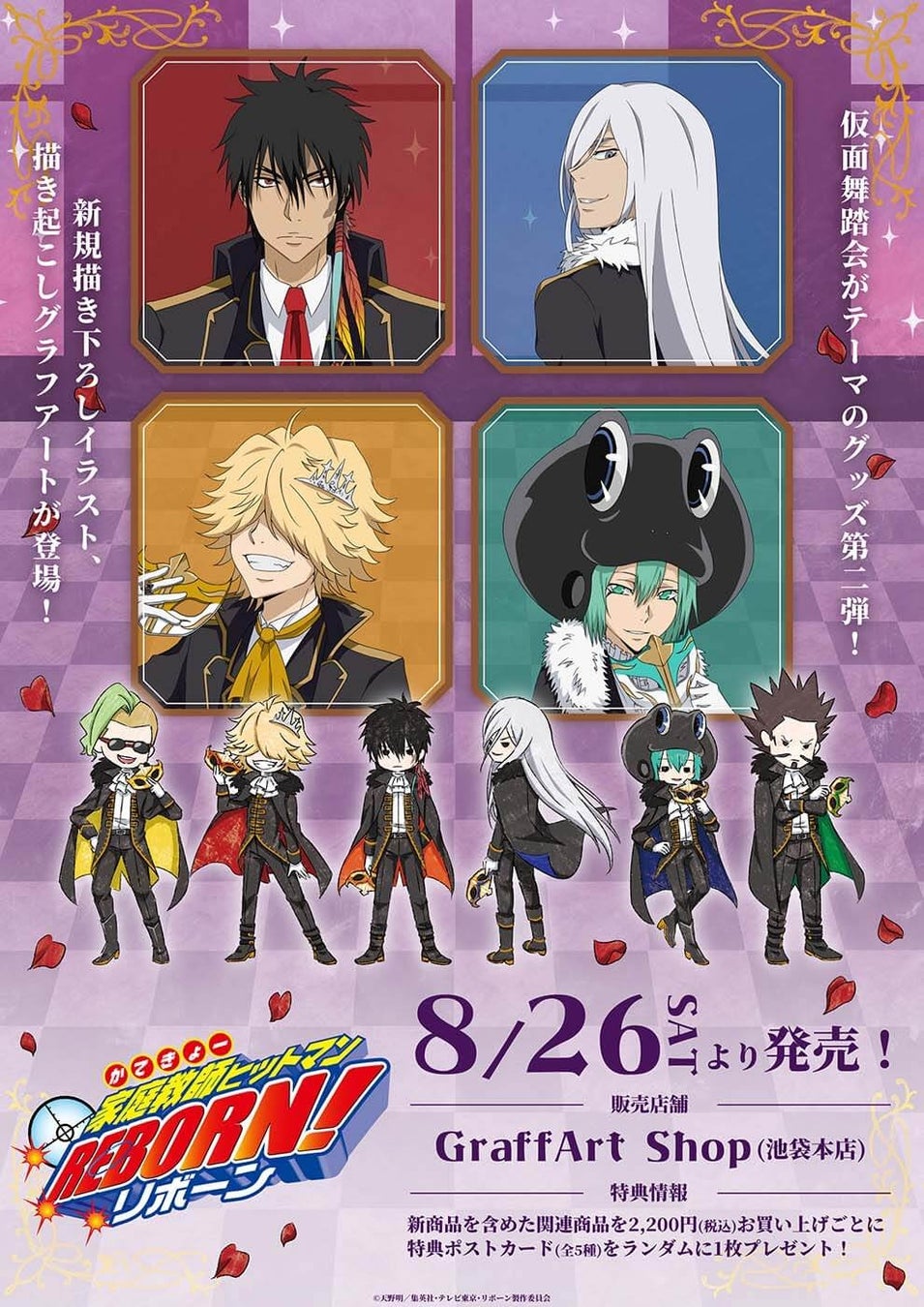今回発売されるのは、仮面舞踏会をテーマにした描き下ろしイラスト&A3オリジナルイラスト・GraffArt(グラフアート)を使用したグッズ。6月から発売中の、リボーンやツナたちの仮面舞踏会シリーズに続く第2弾です!