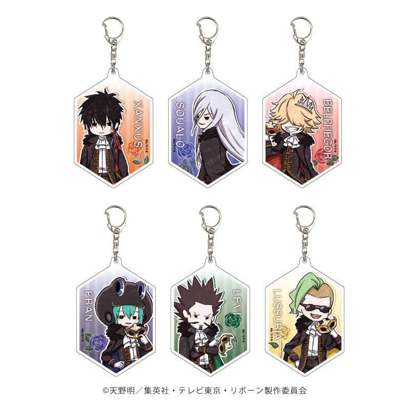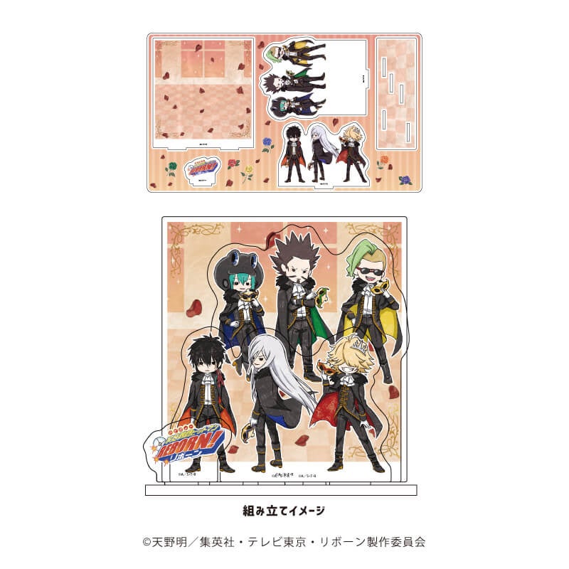 XANXUS、スクアーロ、フラン、ベルフェゴールが勢ぞろいしたデザインのアクリルアートボードは、縦横およそ18cmの大きさ。付属の台座を使うことで、テーブルの上や棚などにも立てて飾ることのできるグッズです!